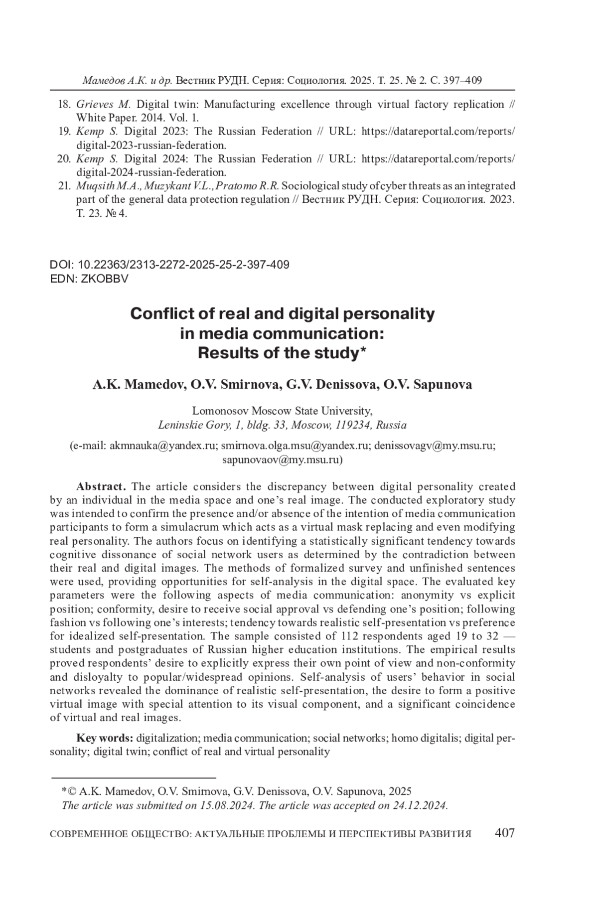 Статья посвящена проблеме несоответствия цифровой личности, создаваемой индивидом в медиапространстве, реальному образу. Проведенное разведывательное исследование было призвано подтвердить наличие и/или отсутствие у современных участников медиакоммуникации намерения сформировать симулякр, который выступает в качестве виртуальной маски, заменяющей и даже модифицирующей реальную личность. Для этого авторы сосредоточились на выявлении статистически значимой тенденции к возникновению когнитивного диссонанса у пользователей социальных сетей, вызванного противоречием реального и цифрового образов. Были применены методы формализованного опроса и незаконченных предложений, обеспечивающие возможности самоанализа поведения индивида в цифровом пространстве. Ключевыми оцениваемыми параметрами выступили следующие аспекты медийной коммуникации: анонимность vs эксплицирование позиции; конформность, стремление к получению социального одобрения vs отстаивание своей позиции; следование моде vs следование своим интересам; тенденция к реалистичной самопрезентации vs предпочтение идеализированной самопрезентации. В опросе приняло участие 112 респондентов (в возрасте от 19 до 32 лет) - студенты и аспиранты российских высших учебных заведений. Полученные эмпирические результаты позволяют говорить о выраженном стремлении респондентов эксплицитно выражать собственную точку зрения, тенденции к неконформности и нелояльности относительно популярного/распространенного мнения. Самоанализ поведения пользователей в социальных сетях выявил доминирование реалистичной самопрезентации и стремление сформировать позитивный образ с особым вниманием к визуальной составляющей виртуального образа, а также позволил обнаружить тенденцию к значительному совпадению виртуального образа с реальным.