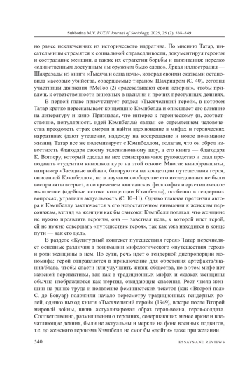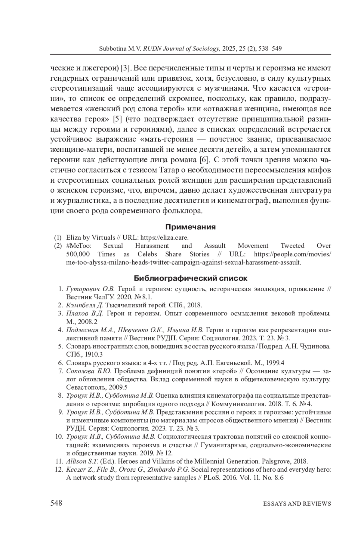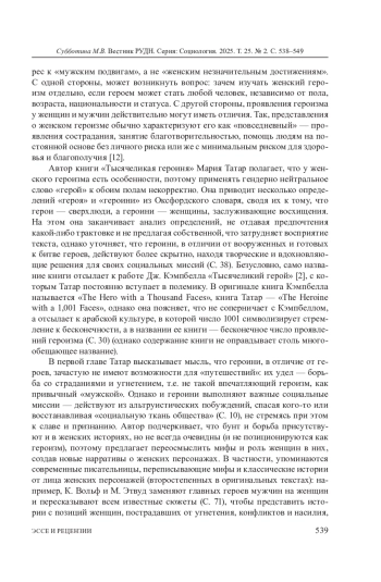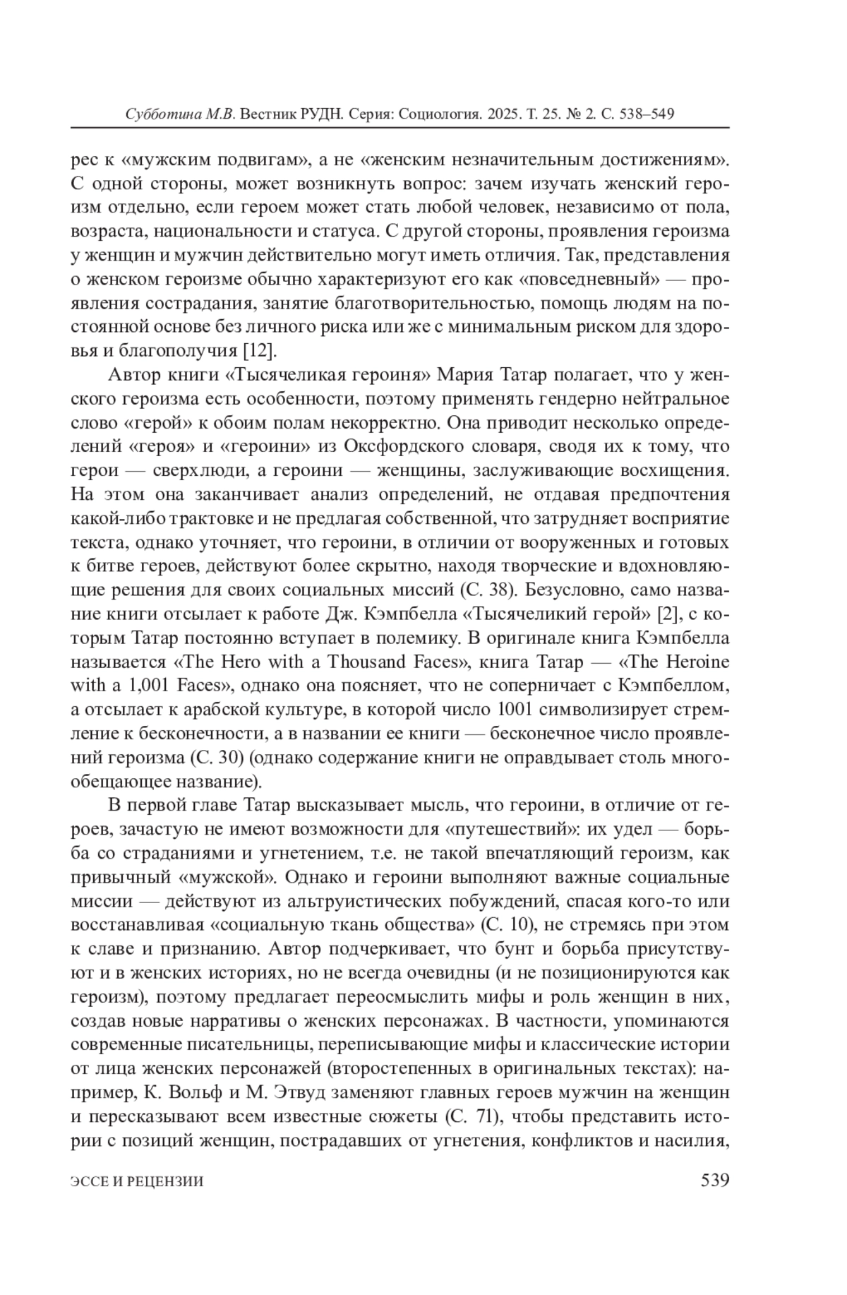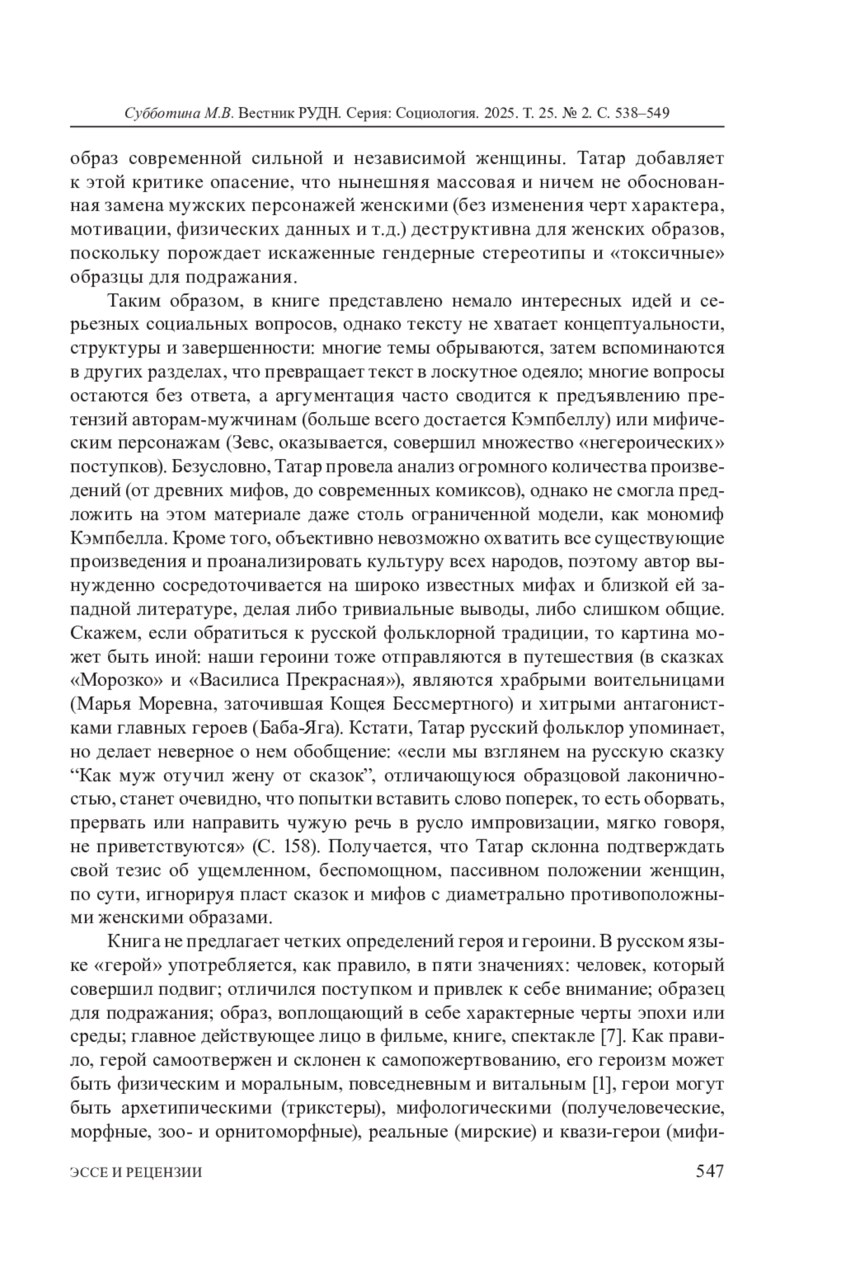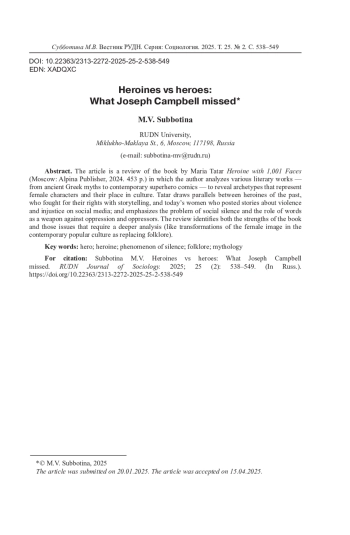 СУББОТИНА М. В. ГЕРОИНИ ПРОТИВ ГЕРОЕВ, ИЛИ ЧТО УПУСТИЛ ДЖОЗЕФ КЭМПБЕЛЛ // ВЕСТНИК РОССИЙСКОГО УНИВЕРСИТЕТА ДРУЖБЫ НАРОДОВ. СЕРИЯ: СОЦИОЛОГИЯ. 2025. Т. 25 № 2