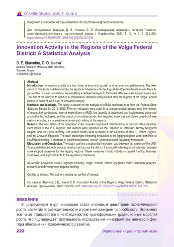 Введение. Инновационная активность является ключевым фактором экономического роста и конкурентоспособности регионов. Актуальность исследования обусловлена значительной дифференциацией уровней технологического развития субъектов Российской Федерации, требующей детального анализа для выработки эффективных мер государственной поддержки.