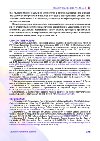2. Андрюхина Н. В., Четаева М. А. Демагогия как манипулятивная тактика в англоязычных политических текстах // Мир науки. Социология, филология, культурология. 2017. № 4. С. 1-8. URL: https://sfk-mn.ru/PDF/06SFK417.pdf (дата обращения: 01.06.2025).