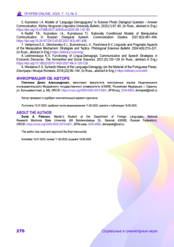 5. Кузнецов И. А. Модели языковой демагогии в русскоязычной фатической диалогической вопросно-ответной коммуникации // Вестник Нижегородского государственного лингвистического университета им. Н. А. Добролюбова. 2025. № 1. С. 67-83. DOI: 10.47388/2072-3490/lunn2025-69-1-67-83