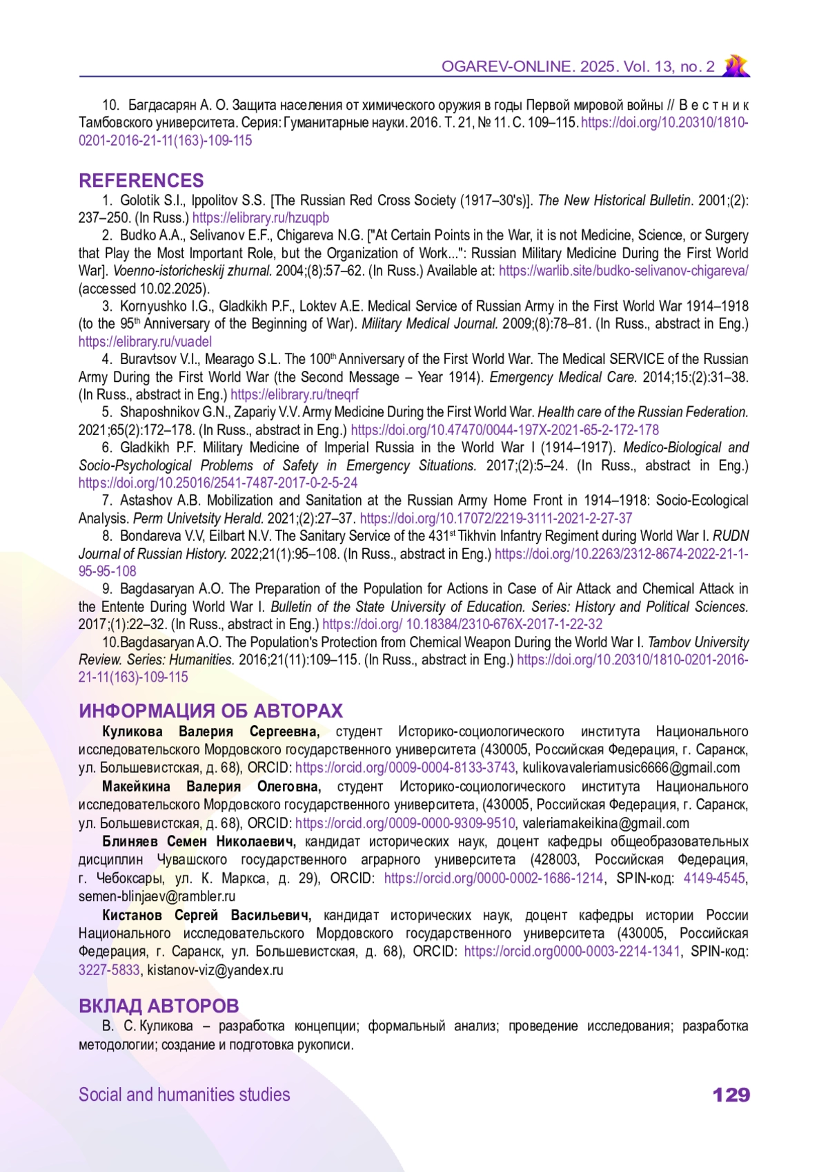 10. Багдасарян А. О. Защита населения от химического оружия в годы Первой мировой войны // Вестник Тамбовского университета. Серия: Гуманитарные науки. 2016. Т. 21, № 11. С. 109-115. DOI: 10.20310/1810-0201-2016-21-11(163)-109-115