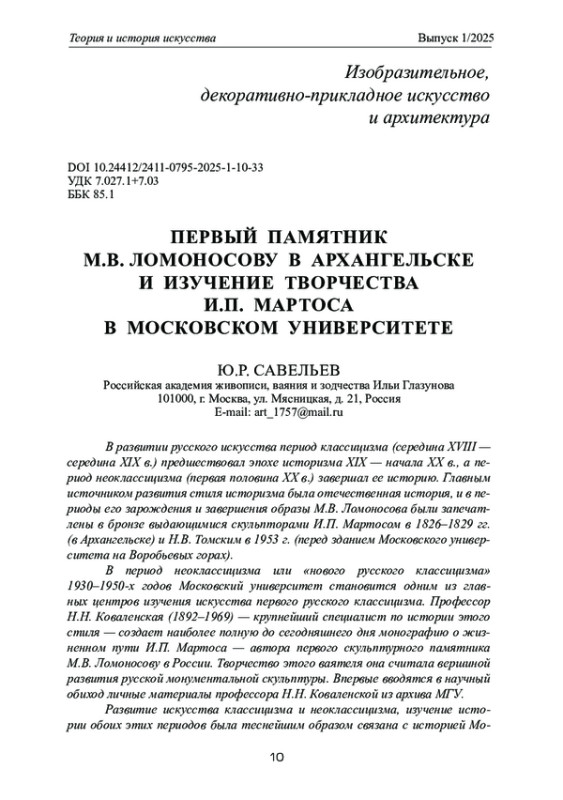 В развитии русского искусства период классицизма (середина XVIII - середина XIX в.) предшествовал эпохе историзма XIX - начала ХХ в., а период неоклассицизма (первая половина ХХ в.) завершал ее историю. Главным источником развития стиля историзма была отечественная история, и в периоды его зарождения и завершения образы М. В. Ломоносова были запечатлены в бронзе выдающимися скульпторами И. П. Мартосом в 1826-1829 гг. (в Архангельске) и Н. В. Томским в 1953 г. (перед зданием Московского университета на Воробьевых горах). В период неоклассицизма или «нового русского классицизма» 1930-1950-х годов Московский университет становится одним из главных центров изучения искусства первого русского классицизма. Профессор Н. Н. Коваленская (1892-1969) - крупнейший специалист по истории этого стиля - создает наиболее полную до сегодняшнего дня монографию о жизненном пути И. П. Мартоса - автора первого скульптурного памятника М. В. Ломоносову в России. Творчество этого ваятеля она считала вершиной развития русской монументальной скульптуры. Впервые вводятся в научный обиход личные материалы профессора Н. Н. Коваленской из архива МГУ. Развитие искусства классицизма и неоклассицизма, изучение истории обоих этих периодов была теснейшим образом связана с историей Московского государственного университета имени М. В. Ломоносова (МГУ), а также с изучением творчества скульптора И. П. Мартоса - автора первого скульптурного монумента основателю университета.