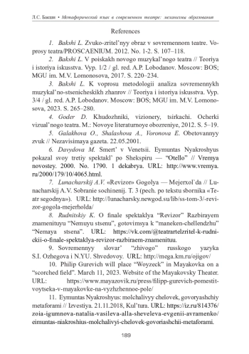 1. Бакши Л. Звуко-зрительный образ в современном театре // Вопросы театра/PROSCAENIUM. 2012. № 1-2. С. 107-118.