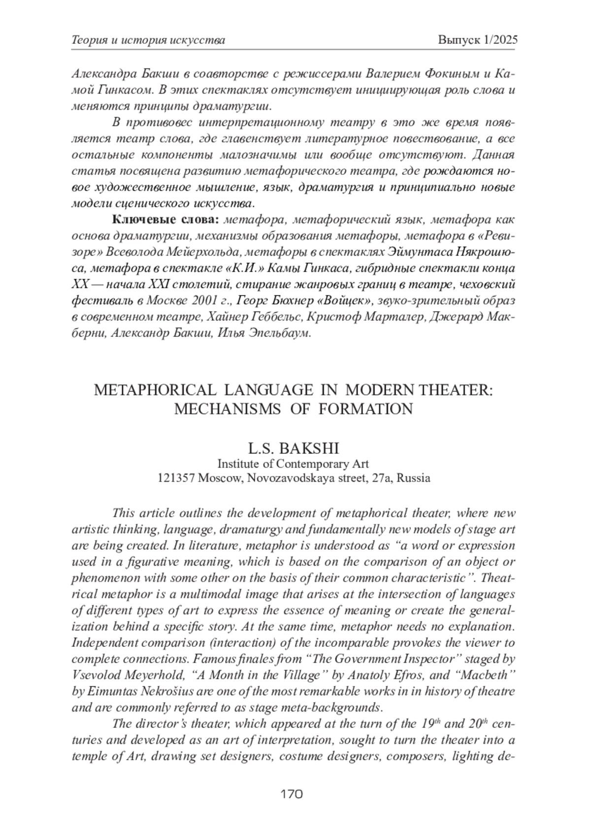 3. Бакши Л. К вопросу методологии анализа современных музыкально-сценических жанров // Теория и история искусства. Вып. 3/4 / гл. ред. А.П. Лободанов. М.: БОС; МГУ им. М.В. Ломоносова, 2023. С. 265-280.