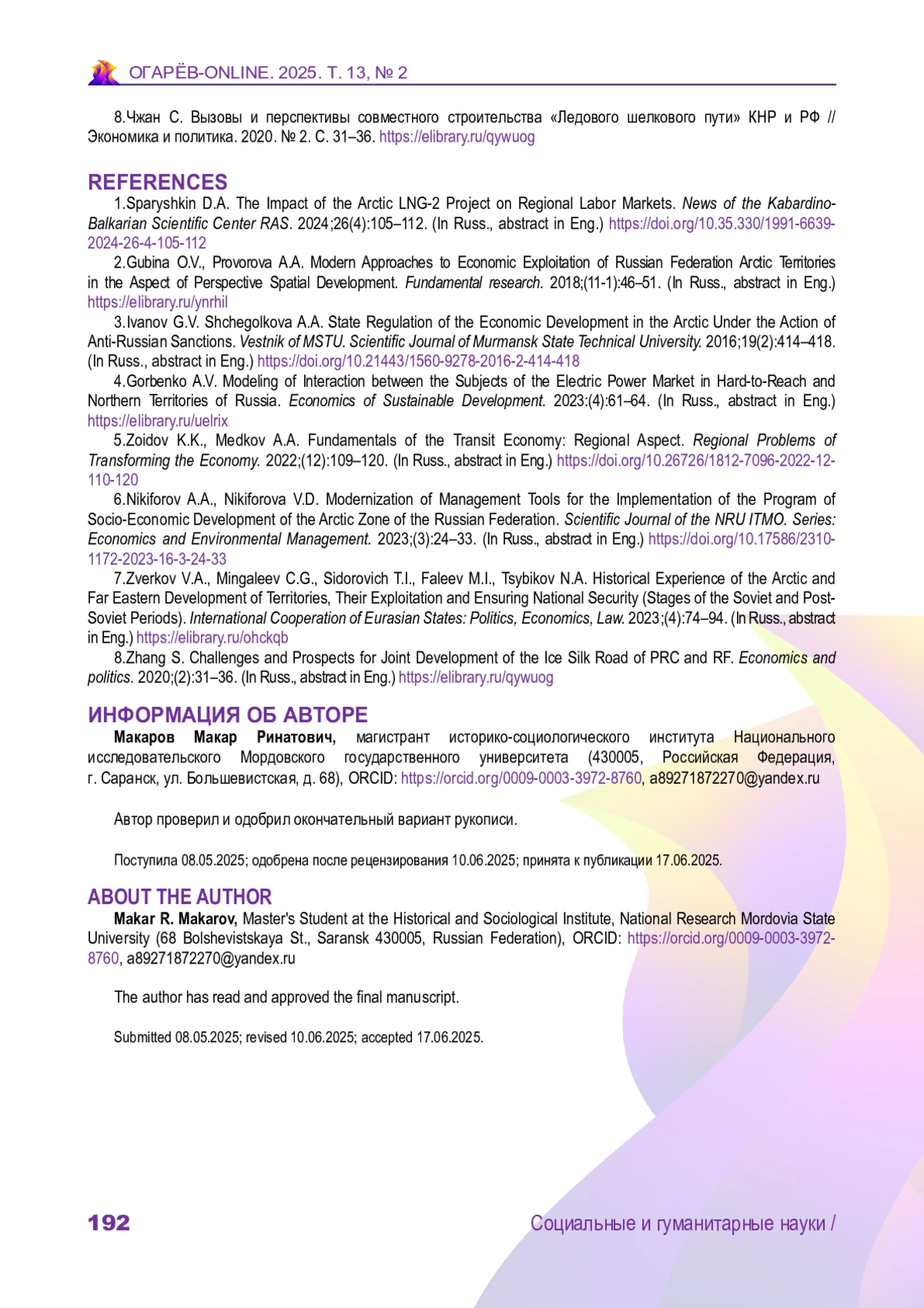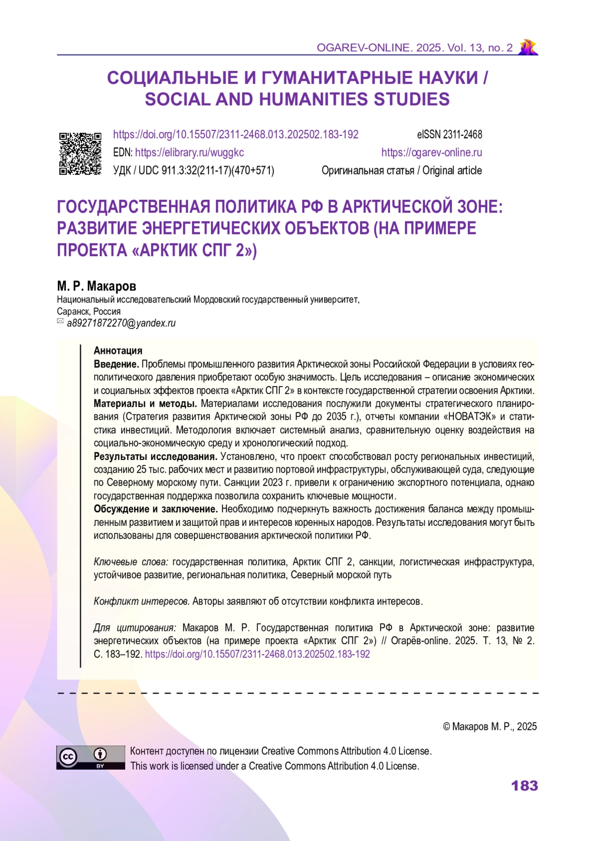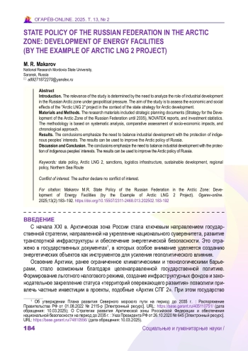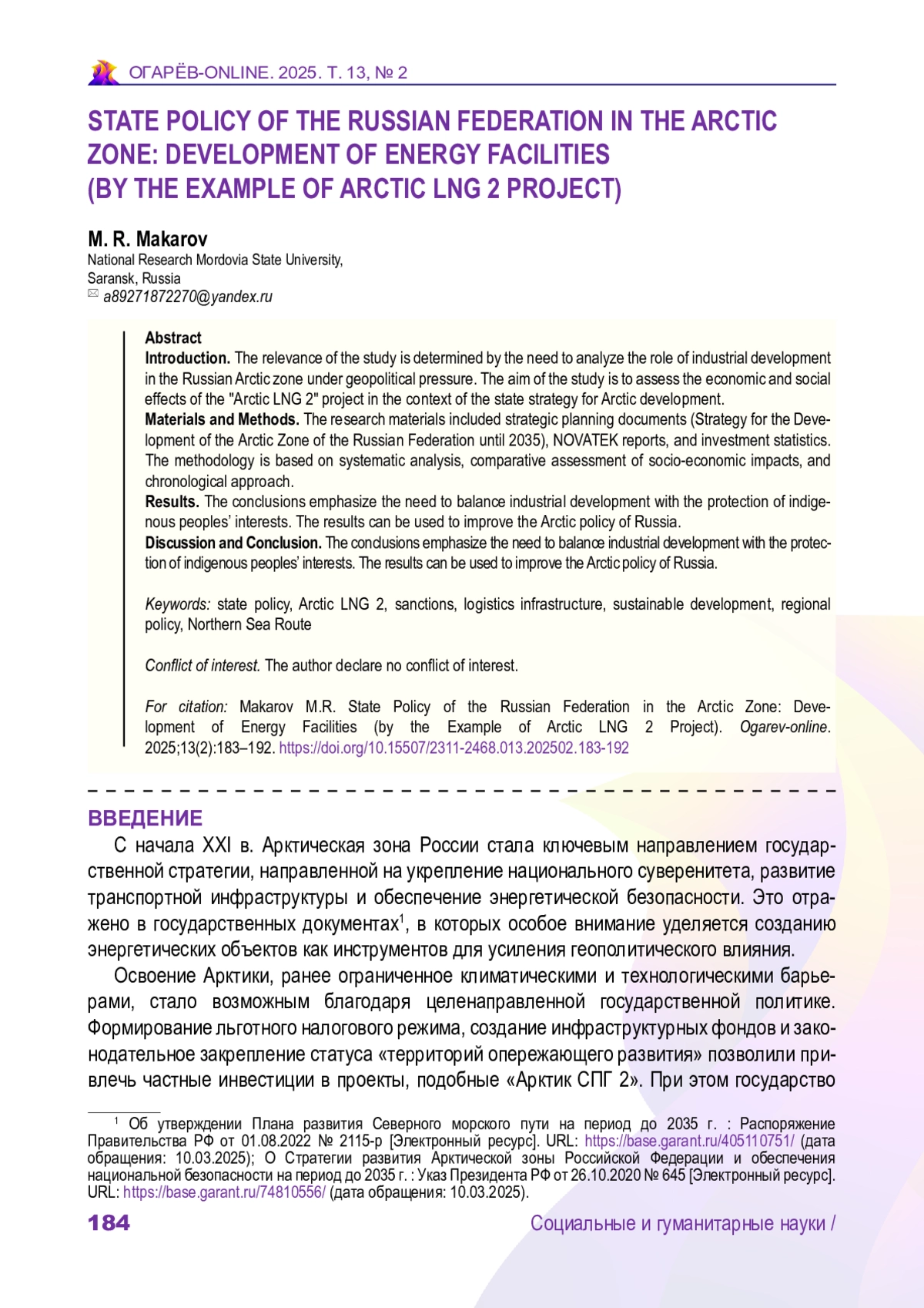 МАКАРОВ М. Р. ГОСУДАРСТВЕННАЯ ПОЛИТИКА РФ В АРКТИЧЕСКОЙ ЗОНЕ: РАЗВИТИЕ ЭНЕРГЕТИЧЕСКИХ ОБЪЕКТОВ (НА ПРИМЕРЕ ПРОЕКТА «АРКТИК СПГ 2») // ОГАРЁВ-ONLINE. 2025. № 2 (219), ТОМ 13
