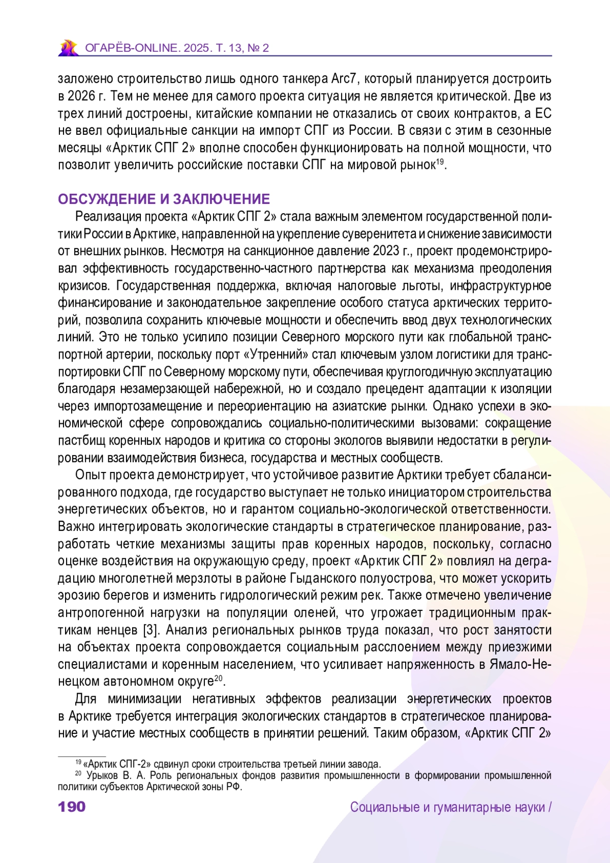 Обсуждение и заключение. Необходимо подчеркнуть важность достижения баланса между промышленным развитием и защитой прав и интересов коренных народов. Результаты исследования могут быть использованы для совершенствования арктической политики РФ.
