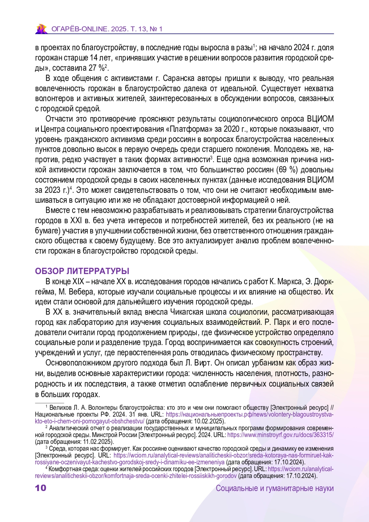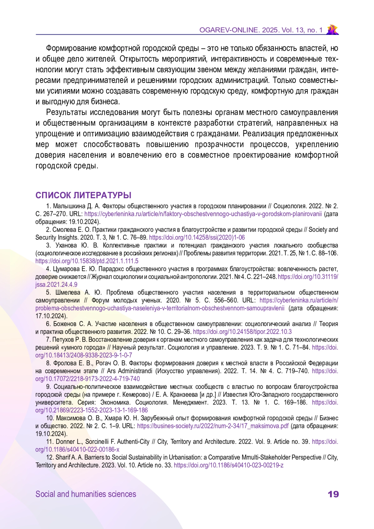 ДОЛГАЕВА Е. И., КАСТОЛИНА А. С. ВОВЛЕЧЕННОСТЬ НАСЕЛЕНИЯ В БЛАГОУСТРОЙСТВО ГОРОДОВ: ПРОБЛЕМЫ И СПОСОБЫ РЕШЕНИЯ // ОГАРЁВ-ONLINE. 2025. № 1 (218), ТОМ 13