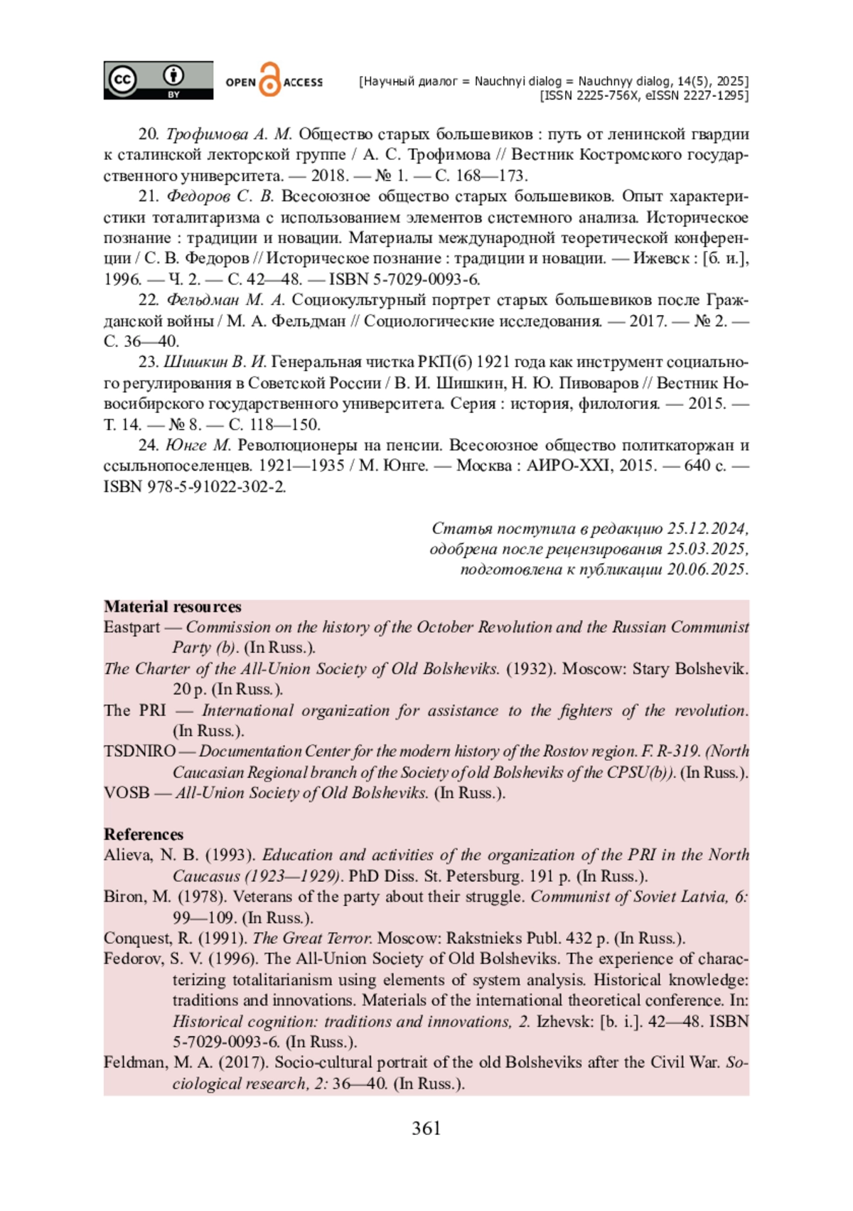 22. Фельдман М. А. Социокультурный портрет старых большевиков после Гражданской войны / М. А. Фельдман // Социологические исследования. - 2017. - № 2. - С. 36-40.