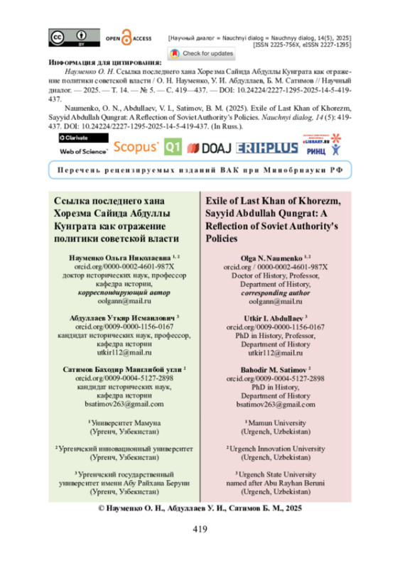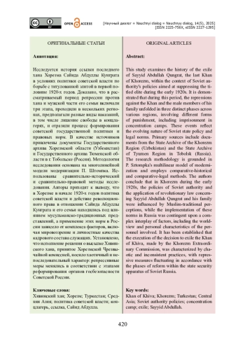 Исследуется история ссылки последнего хана Хорезма Сайида Абдуллы Кунграта в условиях политики советской власти по борьбе с титулованной элитой в первой половине 1920-х годов. Доказано, что в рассматриваемый период репрессии против хана и мужской части его семьи включали три этапа, проходили в нескольких регионах, предполагали разные виды наказаний, в том числе лишение свободы в концлагерях, и отразили процесс формирования советской государственной политики и правовых норм. В качестве источников привлечены документы Государственного архива Хорезмской области (Узбекистан) и Государственного архива Тюменской области в г. Тобольске (Россия). Методология исследования основана на многолинейной модели модернизации П. Штомпка. Использованы сравнительно-исторический и сравнительно-правовой методы исследования. Авторы приходят к выводу, что в Хорезме в начале 1920-х годов политика советской власти и действие революционного права в отношении Сайида Абдуллы Кунграта и его семьи находились под влиянием мусульманско-традиционных представлений, а применение этих норм в России зависело от комплекса факторов, включая мировоззрение и личностные качества кадрового состава служащих. Установлено, что исполнение решения о высылке Хивинского хана, принятое Хорезмской Чрезвычайной комиссией, носило хаотичный и непоследовательный характер: репрессивные меры менялись в соответствии с этапами реформирования органов госбезопасности Советской России.