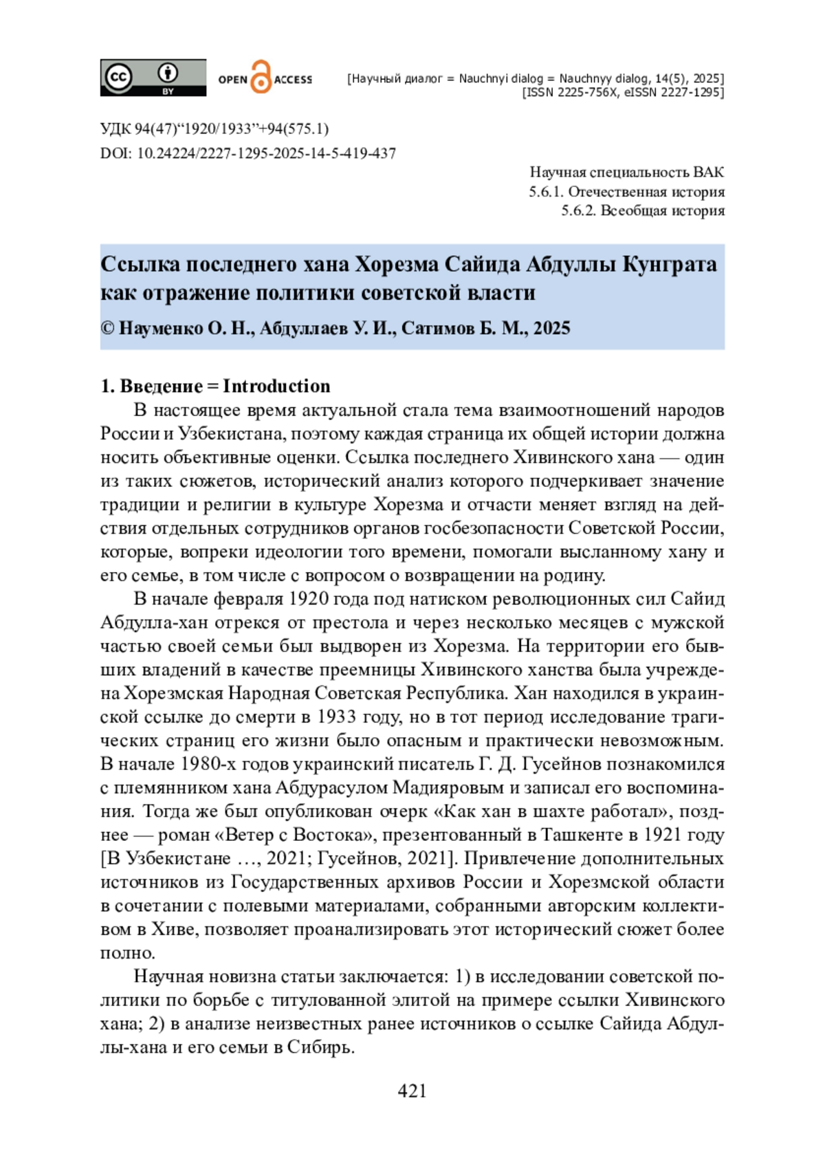 1. Алимова Ю. Государственные должности в Хивинском ханстве (на основе про изведений русских авторов XVIII - XIX вв.) / Ю. Алимова, М. Сардарова // Цифровая наука. - 2021. - № 4-2. - С. 59-63.