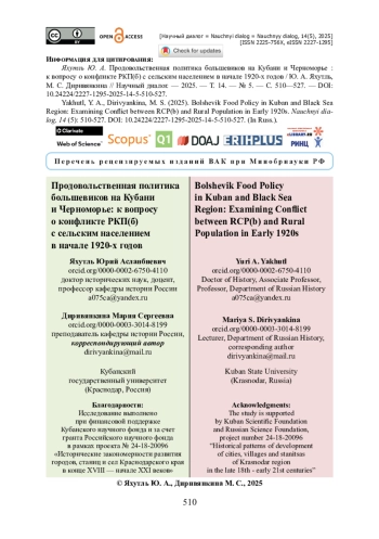 Исследуется содержание продовольственной политики большевиков на Кубани и Черноморье в переходный период от военного коммунизма к новой экономической политике в начале 1920-х годов. При написании статьи применялись историко-генетический, ретроспективный методы и коммуникативный подход. Привлечены различные виды письменных источников, материалы партийных и советских органов власти. Отмечается, что переход к новым средствам сбора продовольствия и формирования новых земельных отношений в казачьем регионе приобретал затяжной характер. Показано, что активное использование в практике большевиков военно-коммунистических методов руководства способствовало росту сопротивления со стороны сельского населения. Авторы утверждают, что вооружённое противостояние сельского населения налоговой политике усиливало репрессивные меры со стороны РКП(б). Подчёркивается, что отсутствие политического согласия в регионе с преобладающим товарным хозяйством требовало поиска компромисса. Выявлено, что он был достигнут за счёт военного доминирования советской власти. Установлено, что земельный вопрос на этом этапе взаимодействия большевиков и сельского населения не имел приоритетного значения и уступал продовольственному вопросу. Авторы приходят к заключению, что к 1924 году, когда окончательно разрешился военный конфликт, была предпринята очередная попытка установить диалог между властью и сельским населением с учётом экономических интересов последнего.