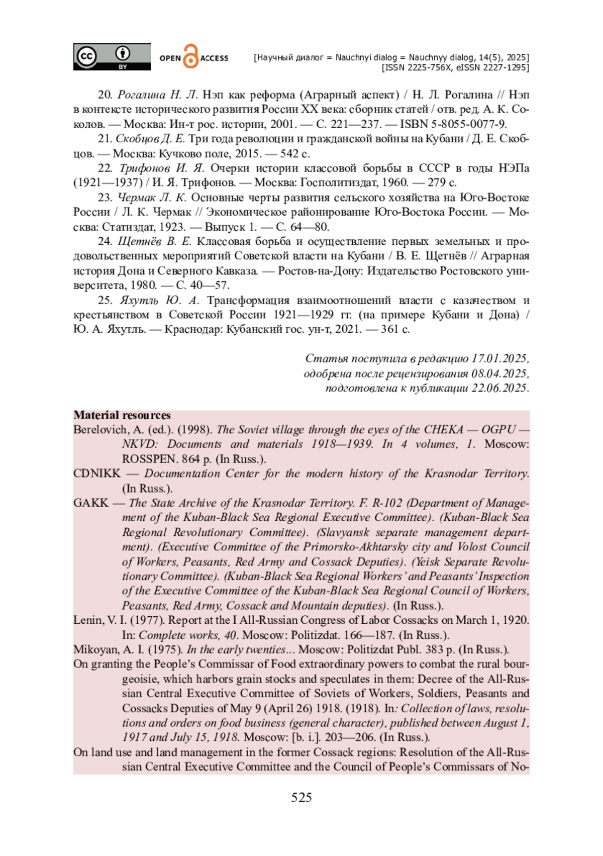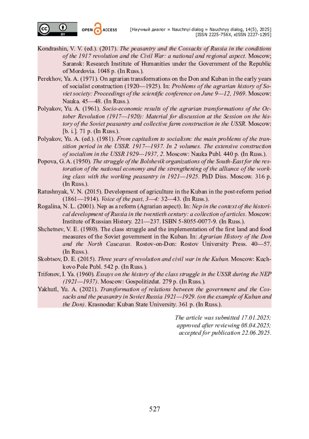 15. Перехов Я. А. Об аграрных преобразованиях на Дону и Кубани в первые годы социалистического строительства (1920-1925 гг.) / Я. А. Перехов // Проблемы аграрной истории советского общества: Материалы науч. конф. 9-12 июня 1969 г. - Москва: Наука, 1971. - С. 45-48.