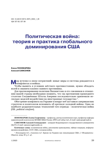 2. Пономарева Е.Г., Самсонов А.Г. Кризис на Украине как спецоперация США // Обозреватель-Observer. 2024. № 3. С. 45-58.