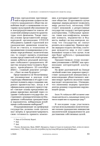 В статье представлен авторский взгляд на особенности гражданского общества в западном цивилизационном пространстве. Универсальные характеристики, содержащиеся в теории политологии, не в полной мере описывают этот феномен. Автор попытался восполнить пробел в конкретном контексте определения западного гражданского общества.