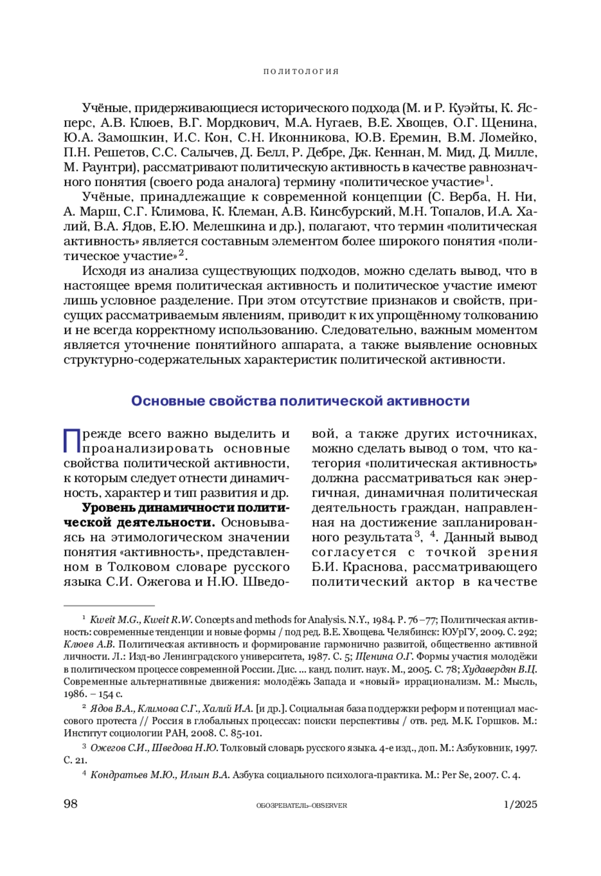 БЕЛИКОВА Е. А. ПОЛИТИЧЕСКАЯ АКТИВНОСТЬ МОЛОДЁЖИ. ПОНЯТИЕ, СОДЕРЖАНИЕ, ОСОБЕННОСТИ ЭЛЕКТОРАЛЬНОГО ПОВЕДЕНИЯ // ОБОЗРЕВАТЕЛЬ. 2025. № 1