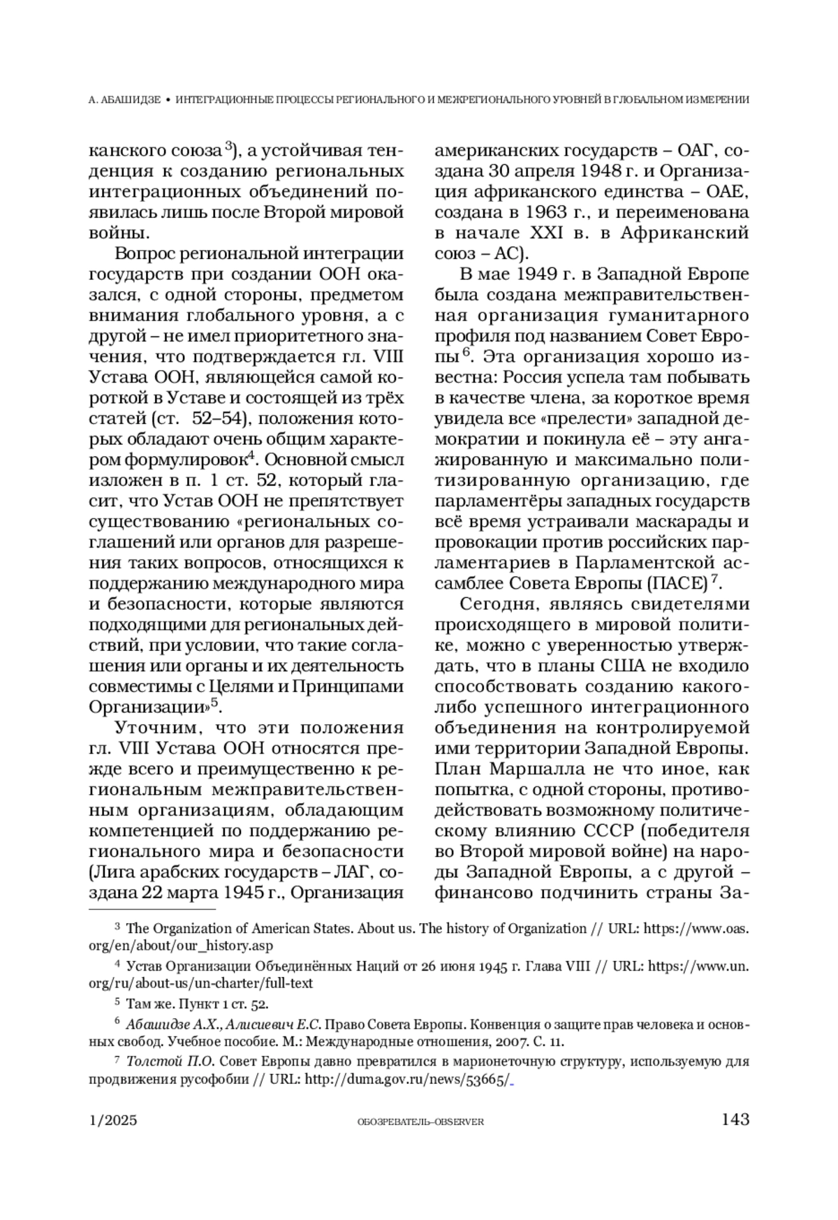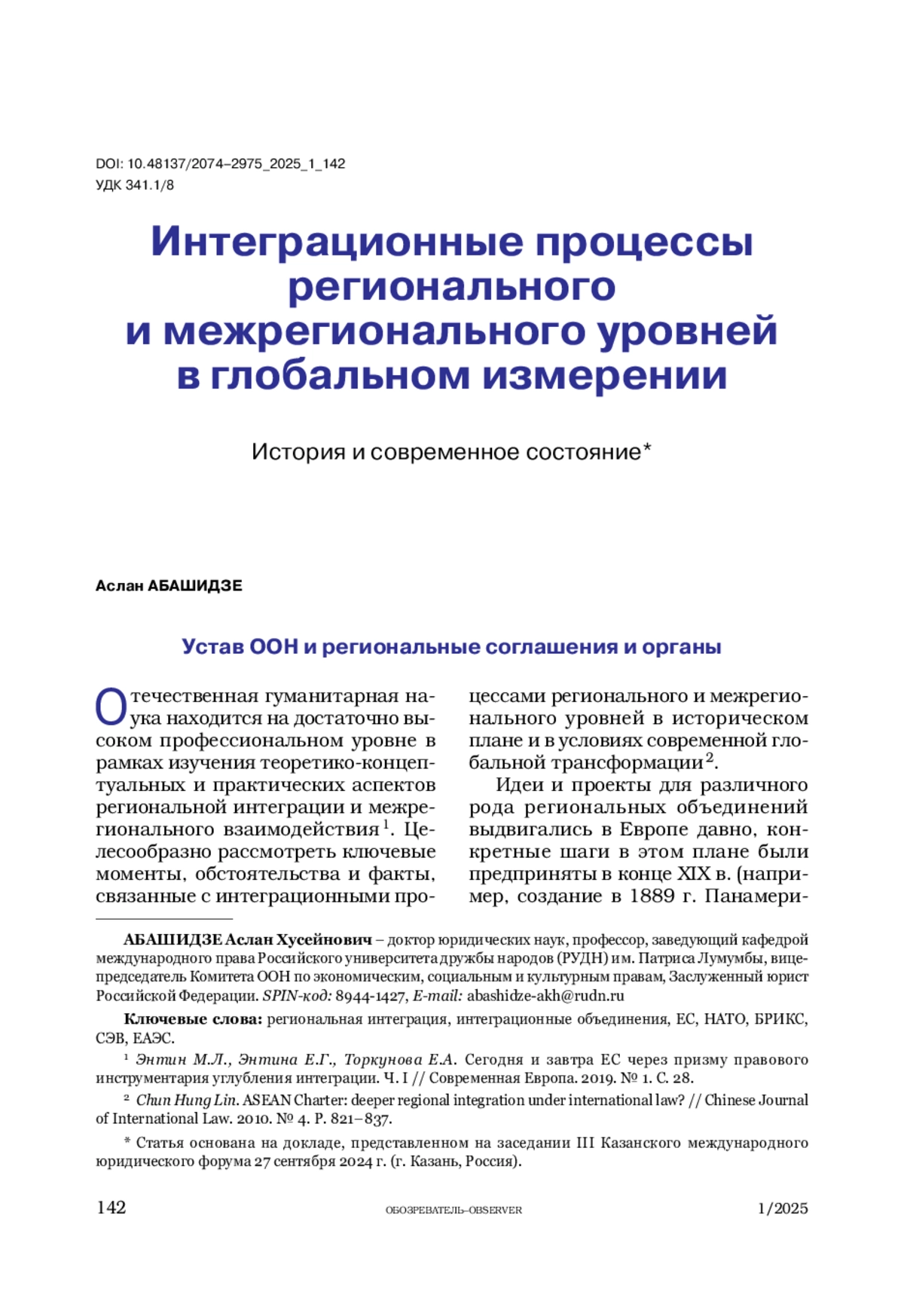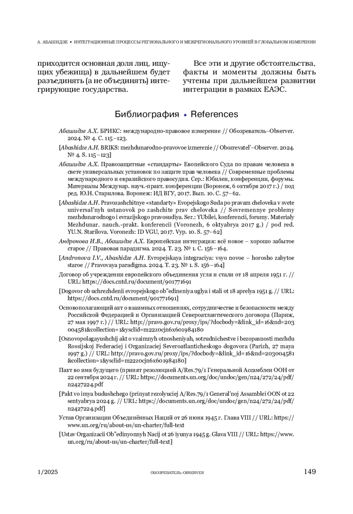 АБАШИДЗЕ А. Х. ИНТЕГРАЦИОННЫЕ ПРОЦЕССЫ РЕГИОНАЛЬНОГО И МЕЖРЕГИОНАЛЬНОГО УРОВНЕЙ В ГЛОБАЛЬНОМ ИЗМЕРЕНИИ. ИСТОРИЯ И СОВРЕМЕННОЕ СОСТОЯНИЕ // ОБОЗРЕВАТЕЛЬ. 2025. № 1