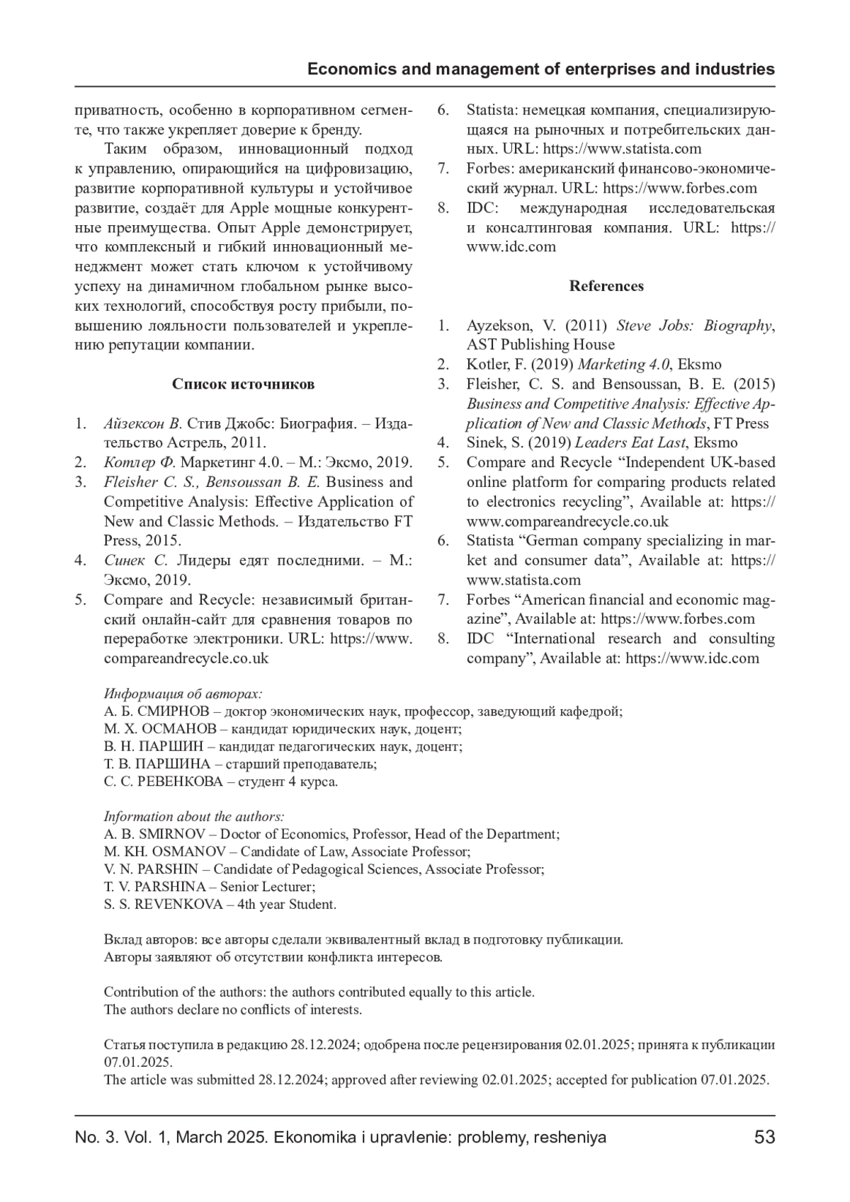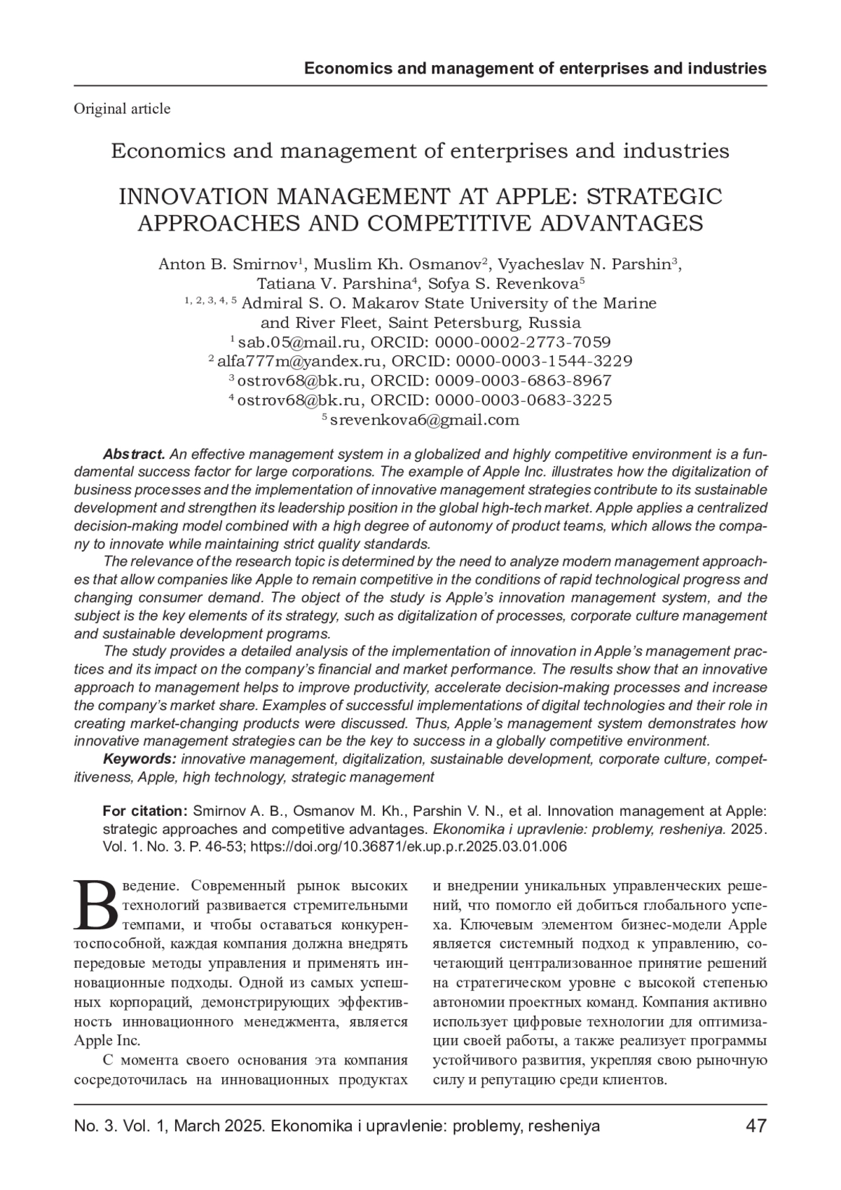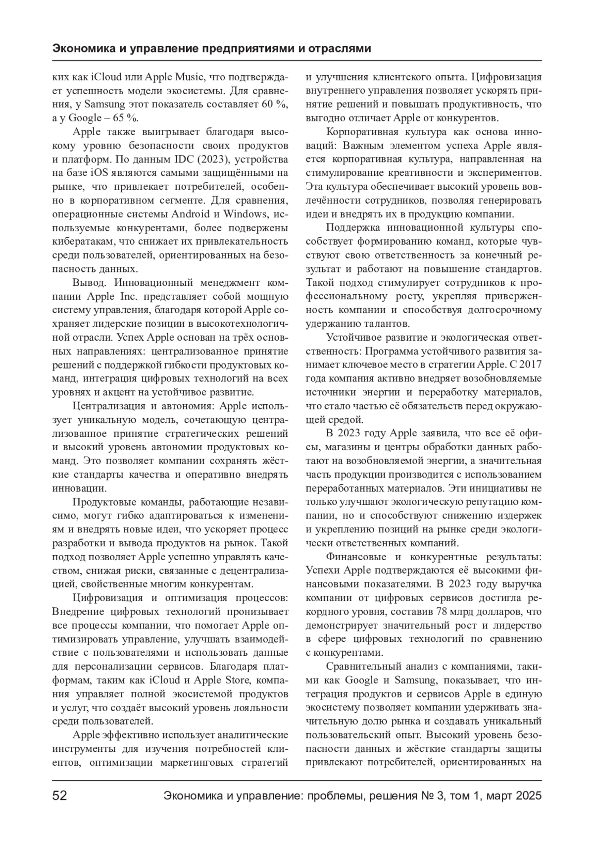 Эффективная система управления в условиях глобализации и высокой конкуренции является основополагающим фактором успеха крупных корпораций. Пример компании Apple Inc. иллюстрирует, как цифровизация бизнес-процессов и внедрение инновационных управленческих стратегий способствуют её устойчивому развитию и укреплению лидерских позиций на мировом рынке высоких технологий. Apple применяет централизованную модель принятия решений в сочетании с высокой степенью автономии продуктовых команд, что позволяет компании внедрять инновации и одновременно поддерживать строгие стандарты качества. Актуальность темы исследования обусловлена необходимостью анализа современных управленческих подходов, которые позволяют компаниям, подобным Apple, сохранять свою конкурентоспособность в условиях стремительного технологического прогресса и меняющегося потребительского спроса. Объектом исследования является система инновационного менеджмента Apple, а предметом - ключевые элементы её стратегии, такие как цифровизация процессов, управление корпоративной культурой и программы устойчивого развития. В ходе исследования проведён детальный анализ внедрения инноваций в управленческую практику Apple, а также их влияние на финансовые и рыночные показатели компании. Результаты показывают, что инновационный подход к управлению способствует улучшению производительности, ускорению процессов принятия решений и увеличению рыночной доли компании. Были рассмотрены примеры успешных внедрений цифровых технологий и их роль в создании продуктов, которые меняют рынок. Таким образом, система управления Apple демонстрирует, как инновационные управленческие стратегии могут стать ключом к успеху в условиях глобальной конкуренции.