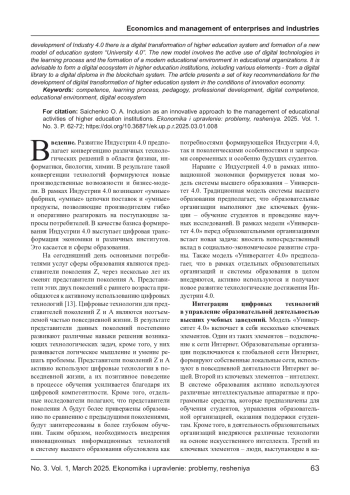 Статья посвящена проблематике интеграции цифровых технологий в управление образовательной деятельностью высших учебных заведений. В условиях формирования инновационной экономики и развития Индустрии 4.0 происходит цифровая трансформация системы высшего образования и формирование новой модели системы образования «Университет 4.0». В рамках новой модели предполагается активное использование цифровых технологий в процессе обучения и формирование в образовательных организациях современной образовательной среды. Целесообразно формирование в вузах цифровой экосистемы, включающей различные элементы - от цифровой библиотеки до цифрового диплома в системе блокчейн. В статье представлен комплекс ключевых рекомендаций по развитию цифровой трансформации системы высшего образования в условиях инновационной экономики.