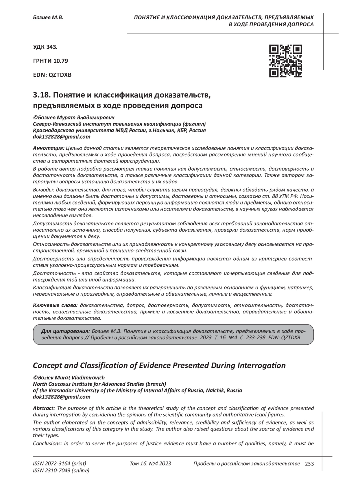 Dinaev R.R. Presentation of evidence as one of the main tactics of interrogation of the accused, who denies his involvement in a robbery or robbery against a minor // Bulletin of the SevKavGTI. - 2011. - Issue. 11. - P. 94-97.