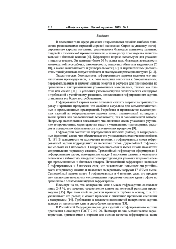 В последние годы сфера упаковки и тары является одной из наиболее динамично развивающихся отраслей мировой экономики. Спрос на упаковку из гофрированного картона постоянно увеличивается благодаря активному развитию пищевой и химической промышленности, а также росту производства вычислительной и бытовой техники [5]. Гофрокартон широко используют для упаковки и защиты товаров. Он занимает более 50 % рынка тары благодаря возможности многократной переработки, экологичности, легкости, гибкости и надежности [7, 10], а также экономичности и универсальности [17]. К перечисленным достоинствам такой упаковки следует добавить и высокую амортизацию нагрузки [2, 3].