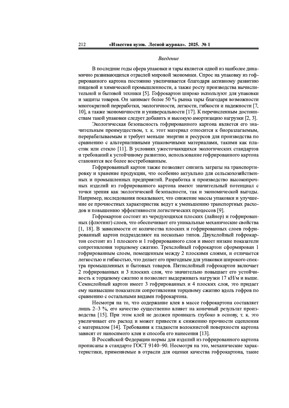 7. Казаков Я.В., Гурьев А.В., Комаров В.И., Крыжановский О.А., Журавлева А.Н. Жесткость при изгибе гофрокартона // Целлюлоза. Бумага. Картон. 2006. No 6. С. 50-53. EDN: HUIPGD