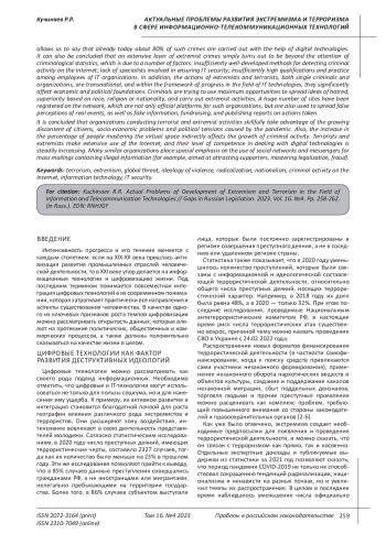 Takov A.Z. The spread of extremist ideology on the Internet: problems of detection and counteraction measures // Journal of Applied Research. 2022. No. 5-2. pp. 196-199.