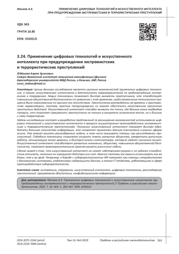 Целью данного исследования является изучение возможностей применения цифровых технологий, а также искусственного интеллекта в деятельности правоохранителей по предупреждению экстремизма и терроризма. Новые технологии позволяют быстро выявлять преступников, что способствует повышению общественной безопасности по сравнению с тем временем, когда применение технического прогресса было невозможным по причине его отсутствия. Преступления распределены во времени и пространстве неравномерно, поэтому простое патрулирование не может обеспечить качественное пресечение преступных действий. Искусственный интеллект способен выявить те точки, где больше всего необходим патруль, это позволяет прекратить преступление не только в конкретно означенном месте, но и близких к нему территориях. Задачи исследования состоят в разработке предложений по расширению возможностей использования цифровых технологий и искусственного интеллекта в процессе осуществления противодействия экстремистским и террористическим преступлениям. Поскольку искусственный интеллект помогает быстро обработать большое количество информации, это позволяет применять данную технологию в разных сферах жизни. Она может решать разнообразные задачи, в том числе оказывать помощь при расследовании преступлений. Подобные технологии позволяют ускорить темпы развития общества, превратить рутинную работу, отнимающую много времени, в быстрый анализ компьютером, который займет несколько минут. Искусственный интеллект способствует развитию экономики, общества, повышению общественной безопасности, помогает правоохранительным органам решать различные задачи. Сделан вывод о том, что искусственный интеллект не имеет собственного разума и не наделен способностью отличать, законные он совершает действия или нет. Именно поэтому его можно использовать как во благо, так и во вред. Например, в борьбе с киберпреступностью ИИ помогает при помощи сотрудничества с банковскими системами, отделениями киберзащиты банков, а также IT-отделами, работающими в сфере противодействия киберпреступности.