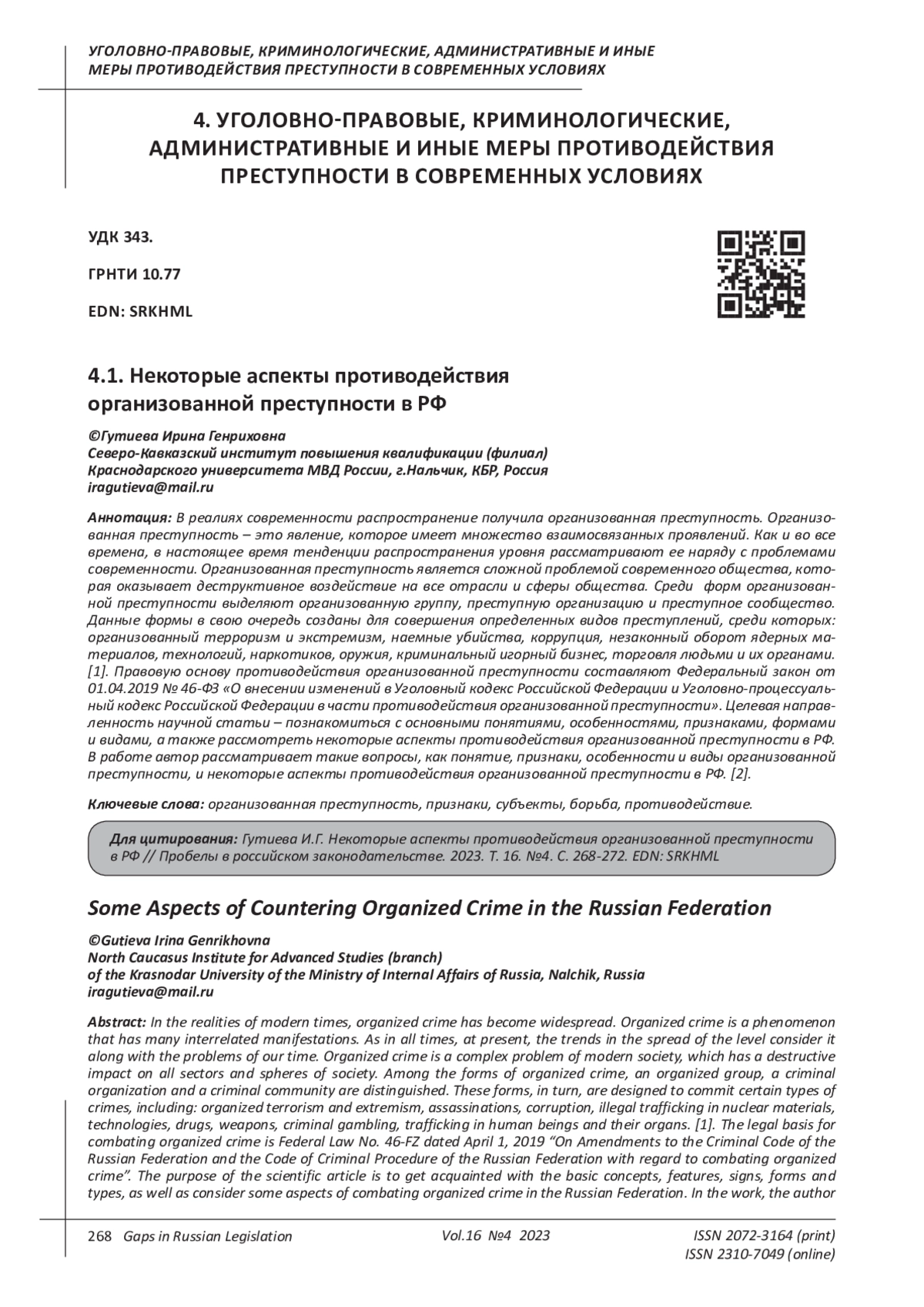 6. Корсаков К.В. Криминологический и уголовно-правовой анализ современной организованной преступности // Научный ежегодник Института философии и права Уральского отделения Российской академии наук. - 2017. - Том 17. - Выпуск 3. - С. 67-84. EDN: ZOLDIN