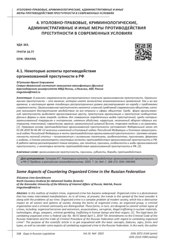 В реалиях современности распространение получила организованная преступность. Организованная преступность - это явление, которое имеет множество взаимосвязанных проявлений. Как и во все времена, в настоящее время тенденции распространения уровня рассматривают ее наряду с проблемами современности. Организованная преступность является сложной проблемой современного общества, которая оказывает деструктивное воздействие на все отрасли и сферы общества. Среди форм организованной преступности выделяют организованную группу, преступную организацию и преступное сообщество. Данные формы в свою очередь созданы для совершения определенных видов преступлений, среди которых: организованный терроризм и экстремизм, наемные убийства, коррупция, незаконный оборот ядерных материалов, технологий, наркотиков, оружия, криминальный игорный бизнес, торговля людьми и их органами. [1]. Правовую основу противодействия организованной преступности составляют Федеральный закон от 01.04.2019 № 46-ФЗ «О внесении изменений в Уголовный кодекс Российской Федерации и Уголовно-процессуальный кодекс Российской Федерации в части противодействия организованной преступности». Целевая направленность научной статьи - познакомиться с основными понятиями, особенностями, признаками, формами и видами, а также рассмотреть некоторые аспекты противодействия организованной преступности в РФ. В работе автор рассматривает такие вопросы, как понятие, признаки, особенности и виды организованной преступности, и некоторые аспекты противодействия организованной преступности в РФ. [2].