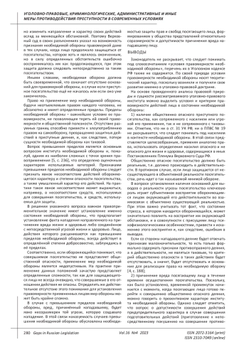 Сегодня в российском государстве на конституционном уровне закрепляется право каждого индивида защищать права и свободы от противоправных посягательств всеми способами, не запрещенными законом, т. е. предоставляет гражданам реальную возможность осуществлять свою самозащиту, а также защиту иных лиц [6, с. 151]. Защита личности и прав обороняющегося или других лиц, охраняемых законом интересов общества или государства от общественно опасного посягательства, если это посягательство было сопряжено с насилием, опасным для жизни обороняющегося или другого лица, либо с непосредственной угрозой применения такого насилия в соответствии со ст. 37 УК РФ признается необходимой обороной.