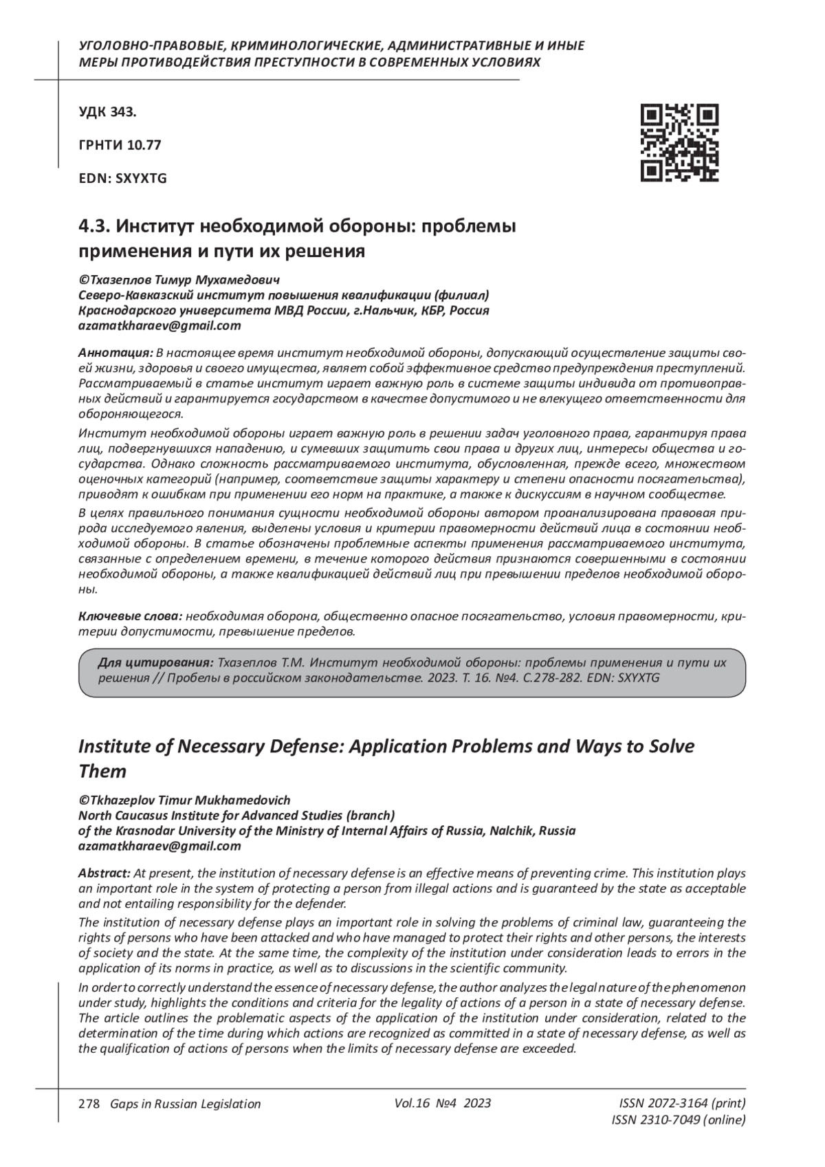 7. Смирнов А.М. Необходимая оборона или необходимая защита? // Вестник Самарского юридического института. 2021. № 2 (43). EDN: DBCEGV