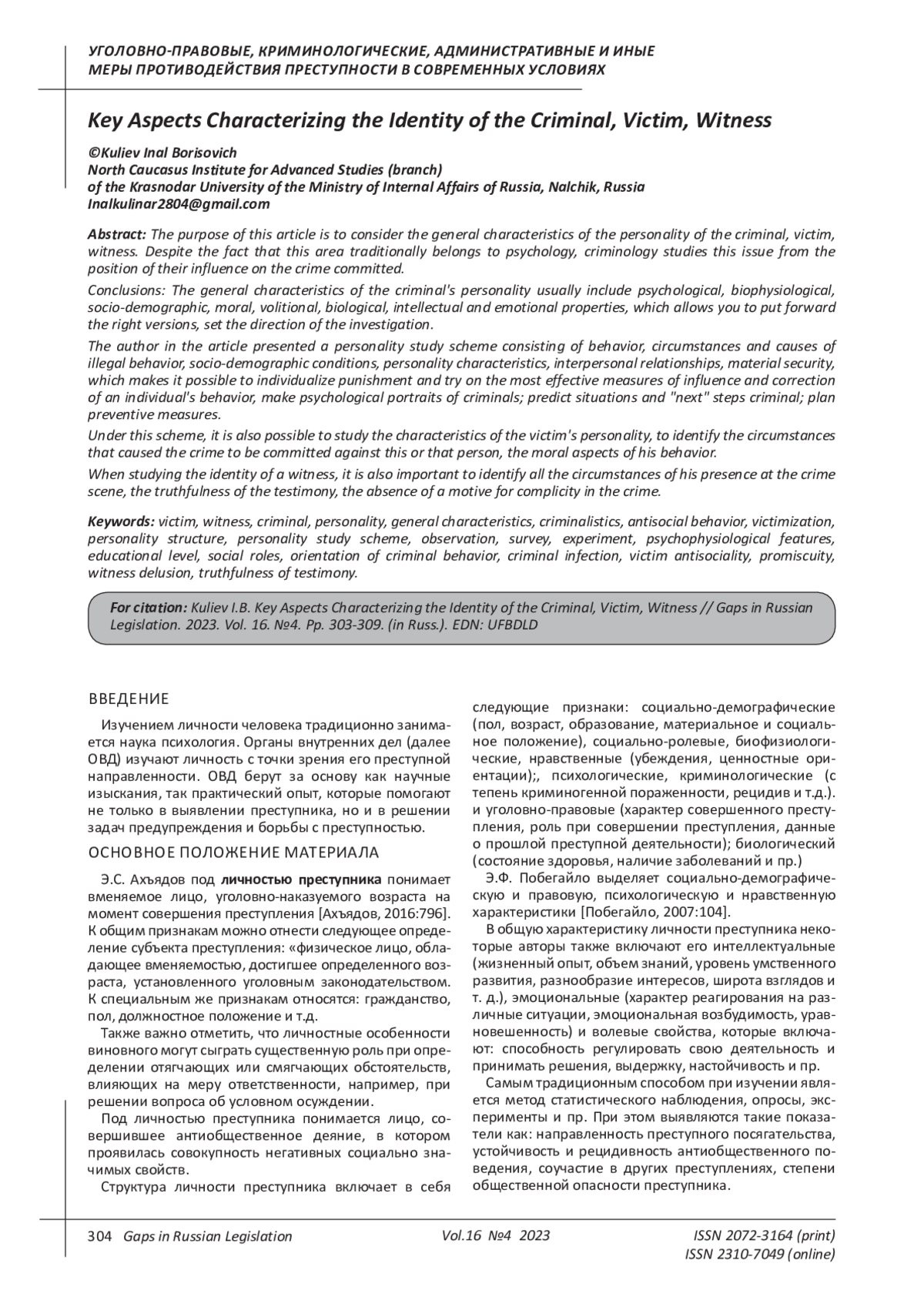 Akhyadov E.S. The identity of the offender: the concept and structure // Young scientist. 2016. - No. 9 (113). - P. 796-797. EDN: VWEPIJ