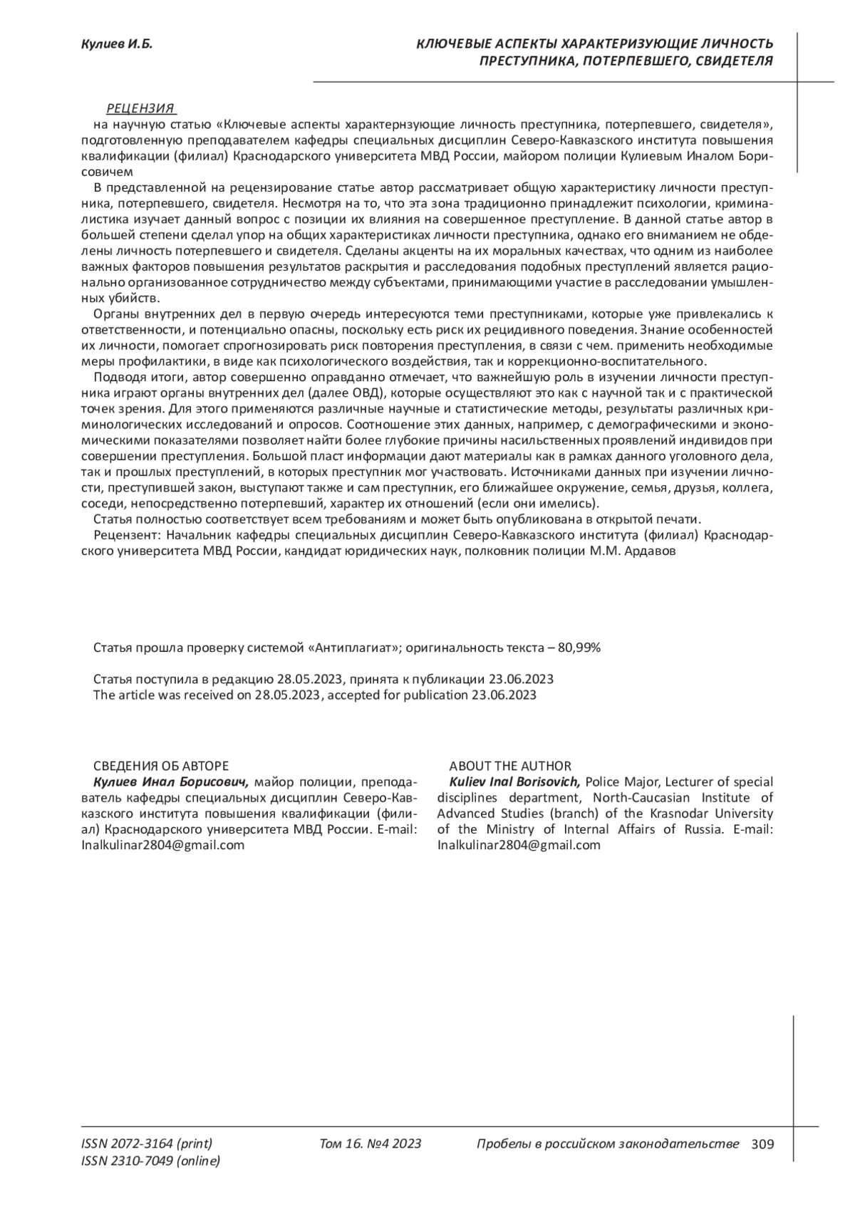 7. Игнатов А.Н. Социально-демографическая и уголовно-правовая характеристика личности современного насильственного преступника // Криминология: вчера, сегодня, завтра. Журнал Санкт-Петербургского международного криминологического клуба. - 2015. - № 4 (39). - С. 93-98. EDN: WCDODZ