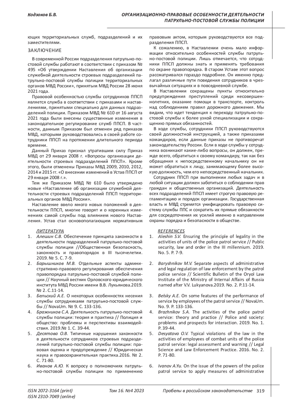 4. Бражников С.А. Деятельность патрульно-постовой службы полиции: теория и практика // Полиция и общество: проблемы и перспективы взаимодействия. 2019.№ 1. С. 39-44. EDN: ZSZBBB