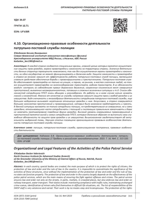 11. Майко А.Н. Административно-правовой статус патрульно-постовой службы // Вестник студенческого научного общества ГОУ ВПО “Донецкий национальный университет”. 2019. Т.4. № 11. С. 231-234. EDN: UHMRQY