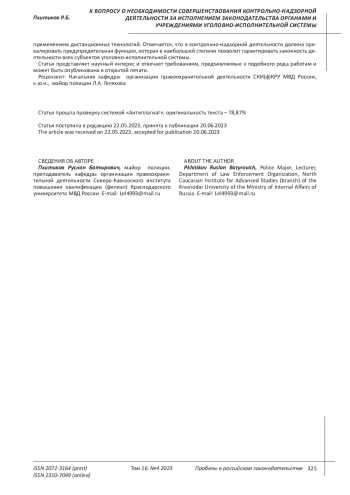 В условиях нестабильной социально-политической обстановки в стране и мире необходимо обращать особое внимание на обеспечение прав наиболее незащищенных категорий граждан, к которым относятся в том числе и осужденные. Обеспечение законности в органах и учреждениях УИС является определяющим критерием эффективности их функционирования. Наиболее действенным способом обеспечения законности в уголовно-исполнительной следует признать контроль и надзор, который в пенитенциарной сфере наиболее широко представлен такими видами как общественный контроль и прокурорский надзор. В последние годы все больше внимания со стороны государства уделяется вопросам совершенствования контрольно-надзорной деятельности в различных сферах жизнедеятельности. В данной статье рассмотрены некоторые проблемные аспекты осуществления контроля и надзора в пенитенциарной системе, а также обозначены направления совершенствования указанной деятельности. В целях обеспечения прав осужденных и исполнения законодательства пенитенциарными учреждениями автором обосновывается целесообразность закрепления возможности осуществления общественного контроля с применением дистанционных технологий. Отмечается, что в контрольно-надзорной деятельности должна превалировать предупредительная функция, которая в наибольшей степени позволит гарантировать законность деятельности всех субъектов уголовно-исполнительной системы.