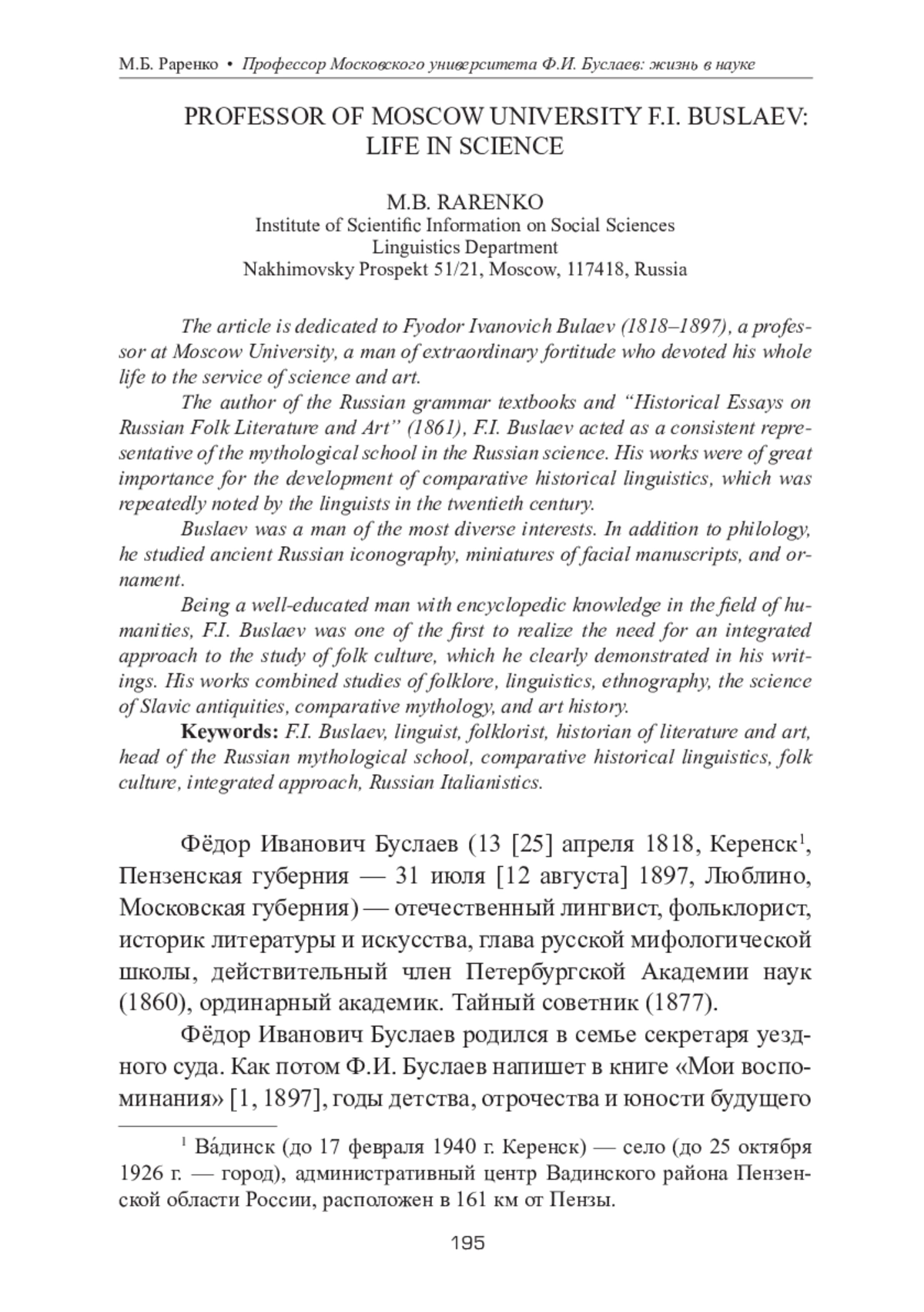 6. Раренко М.Б. Федор Иванович Буслаев: К 200-летию рождения // Литературоведческий журнал. - 2019. - № 45.- С. 116-154. EDN: DDOVHM