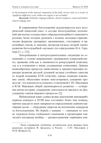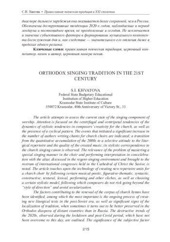В статье предпринимается попытка оценки современного состояния певческого компонента богослужения. Акцентируется внимание на центробежных и центростремительных тенденциях динамики стилевых тенденций композиторского творчества для церкви, а также наличия циклической закономерности. Указываются события, инициировавшие значительный рост числа авторов, пишущих песнопения для церковных хоров, наблюдается переход от количественного накопления 2000-х годов к избирательному отношению к богослужебному репертуару и качеству созданной музыки, ее стилистическому соответствию церковно-певческому канону. Отмечается актуальность проблемы освоения особой певческой манеры на клиросе и исполнительской интерпретации в сослужении с алтарем, обсуждаемой в регентско-певческой среде и выносимой на трибуны международных съездов, проводимых в Храме Христа Спасителя. Затрагиваются вопросы технологии создания новых репертуарных единиц для церковного хора путем следования определенным музыкально-поэтическим, образно-тематическим, синтаксическим, конструктивным, фактурным, лексическим, исполнительским и другим клише, а также избрания определенной стилистической модели, следуя которой композиторы не рискуют выйти за пределы «стиля направления» и избежать секуляризации. Выявлены факторы, способствующие обновлению корпуса церковных песнопений, среди которых важнейшим является продолжающийся процесс создания новых богослужебных текстов в постсоветское время, а также существенные признаки локализации традиции, когда порой в православной диаспоре дальнего зарубежья она оказывается более сохранной, чем в России. Обозначены деструктивные тенденции 2020-х годов, наблюдаемые в период локдауна и постковидное время, не преодоленные и сегодня. Не исключается и значение субъективного фактора в формировании музыкального компонента богослужения дня и, как следствие — значительного его отличия даже в пределах одного региона