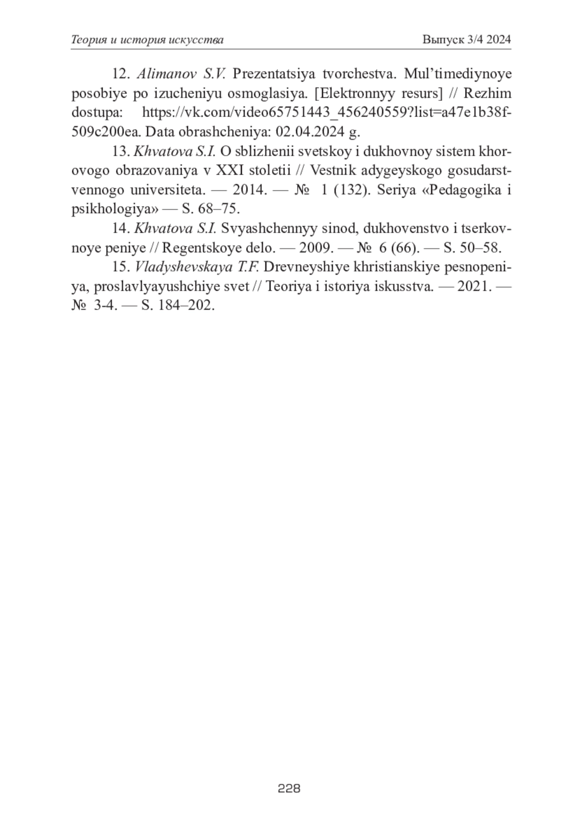 13. Хватова С.И. О сближении светской и духовной систем хорового образования в XXI столетии // Вестник адыгейского государственного университета. - 2014. - № 1 (132). Серия “Педагогика и психология” - С. 68-75. EDN: SFDMPB