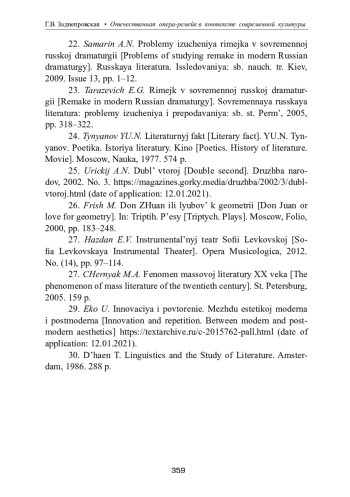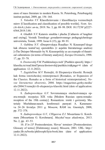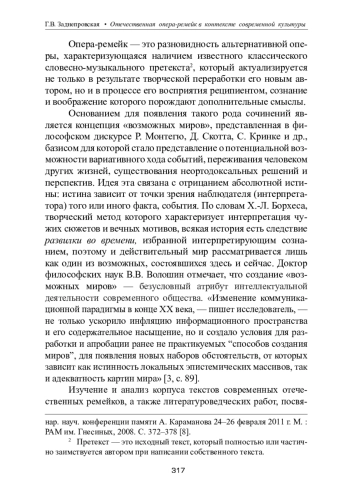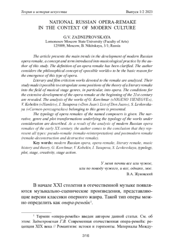 ЗАДНЕПРОВСКАЯ Г. В. ОТЕЧЕСТВЕННАЯ ОПЕРА-РЕМЕЙК В КОНТЕКСТЕ СОВРЕМЕННОЙ КУЛЬТУРЫ // ТЕОРИЯ И ИСТОРИЯ ИСКУССТВА. 2023. № 1-2