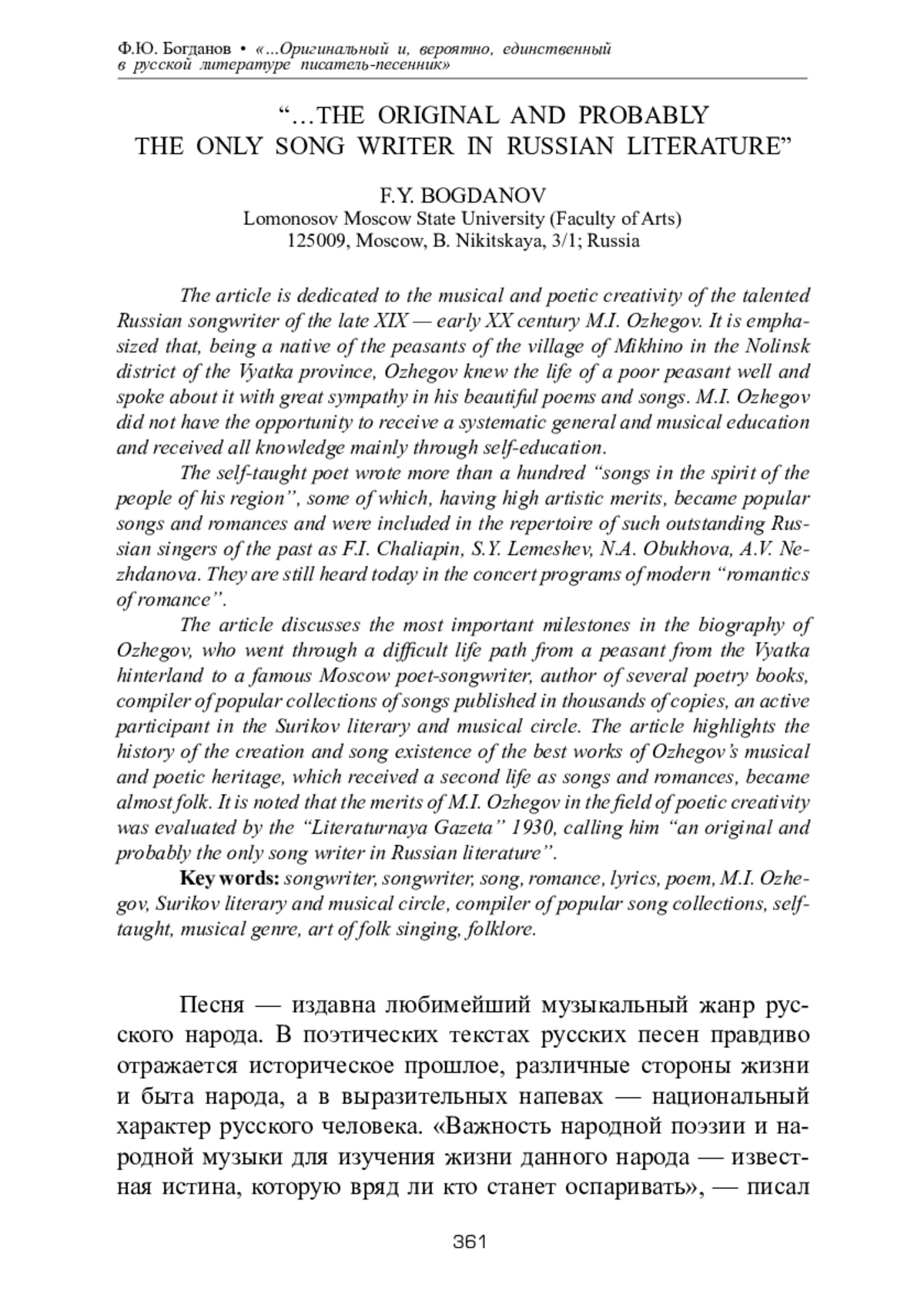 Статья посвящена музыкально-поэтическому творчеству талантливого русского писателя-песенника конца XIX — начала XX в. М. И. Ожегова. Особо подчеркивается, что, будучи выходцем из крестьян деревни Михино Нолинского уезда Вятской губернии, Ожегов хорошо знал жизнь крестьянина-бедняка и с большим сочувствием рассказывал о ней в своих прекрасных стихотворениях и песнях. М. И. Ожегов не имел возможности получить систематического общего и музыкального образования и все знания получил в основном посредством самообразования. Поэт-самоучка написал более сотни «песен в духе народа своего края», некоторые из которых, обладающие высокими художественными достоинствами, стали популярными песнями и романсами и входили в репертуар таких выдающихся русских певцов прошлого, как Ф. И. Шаляпин, С. Я. Лемешев, Н. А. Обухова, А. В. Нежданова. Они и сегодня звучат в концертных программах современных «романтиков романса». В статье рассматриваются важнейшие вехи биографии Ожегова, прошедшего нелегкий жизненный путь от крестьянина из вятской глубинки до известного московского поэта-песенника, автора нескольких поэтических книг, составителя популярных сборников песен, выходивших многотысячными тиражами, активного участника Суриковского литературно-музыкального кружка. Освещается история создания и песенного бытования лучших произведений музыкально-поэтического наследия Ожегова, которые получили вторую жизнь в качестве песен и романсов, стали практически народными. Отмечено, что заслуги М. И. Ожегова в области поэтического творчества еще в 1930 году оценила «Литературная газета», назвав его «оригинальным и, вероятно, единственным в русской литературе писателем-песенником»