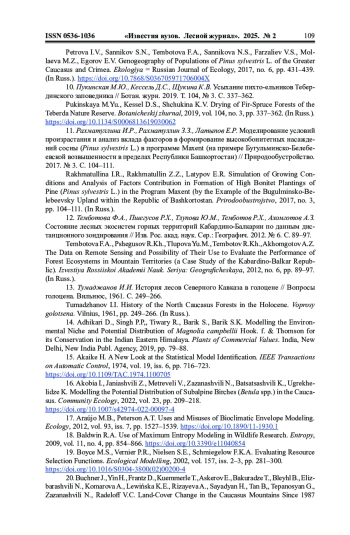 16. Akobia I., Janiashvili Z., Metreveli V., Zazanashvili N., Batsatsashvili K., Ugrekhelidze K. Modelling the Potential Distribution of Subalpine Birches (Betula spp.) in the Caucasus. Community Ecology, 2022, vol. 23, pp. 209-218. DOI: 10.1007/s42974-022-00097-4 EDN: VFLNCM