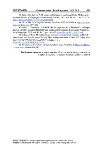 40. Title P.O., Bemmels J.B. ENVIREM: An Expanded Set of Bioclimatic and Topographic Variables Increases Flexibility and Improves Performance of Ecological Niche Modeling. Ecography, 2018, vol. 41, iss. 2, pp. 291-307. DOI: 10.1101/075200
