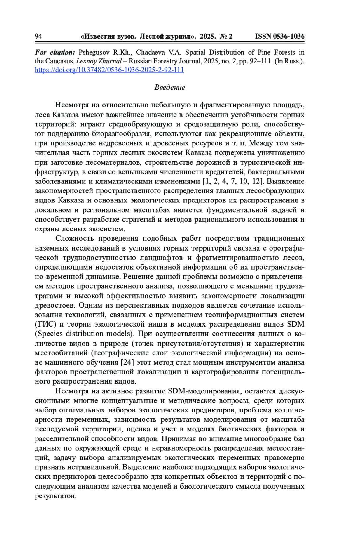 35. Pshegusov R., Tembotova F., Chadaeva V., Sablirova Y., Mollaeva M., Akhomgotov A. Ecological Niche Modeling of the Main Forest-Forming Species in the Caucasus. Forest Ecosystems, 2022, vol. 9, art. no. 100019. DOI: 10.1016/j.fecs.2022.100019 EDN: IELQNZ