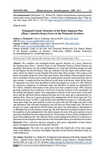 Описано состояние и эколого-ценотическая (парцеллярная) структура рощи, сформированной сосной погребальной, или могильной (Pinus × funebris Kom.), в Приморском крае (Уссурийский район). Такие рощи - остаточные фрагменты реликтовой сосновой формации уникальной не только для края, но и для России. Они приурочены к сухим склонам южных экспозиций, подверженных более частым лесным пожарам, чем другие экотопы. Это создает реальную угрозу полного исчезновения реликтовых сосняков. Проблема сохранения формации согласуется с необходимостью изучения пространственной (парцеллярной) структуры и мониторинга состояния сосновых ценозов. На склоне в роще заложена пробная площадь, на которой детально описаны и закартированы в масштабе 1:100 все ярусы растительного покрова, с последующим попарным сравнением картосхем и выделением парцелл (в трактовке Н. В. Дылиса). Детальные наблюдения за рощей ведутся с 1992 г. Экстремальные условия произрастания обусловили низкий уровень видового богатства всех сообществ на изученном и соседних склонах. Состав видов нижних ярусов в сосновой роще и дубняке, сменившем сосняк, одинаков и представлен ксерофитной флорой. В подлеске обоих типов леса присутствуют 2 вида, в травяном ярусе - 19. В 2003 г. в роще было выделено 5 парцелл: 3 с доминированием сосны (сосновая осоковая, сосновая редкопокровная, сосновая с дубом разнотравно-осоковая) и 2 с доминированием дуба (дубовая с сосной (ксерофитная) и дубовая марьянниково-осоковая). Основа рощи - сосновая осоковая парцелла с материнским древостоем. В ней начался распад древостоя, хотя он еще не достиг перестойного возраста. К 2019 г. осталось 4 парцеллы: из-за перехода подроста сосны в категорию древостоя площадь сосновой редкопокровной парцеллы распределилась между смежными парцеллами. Наличие в «дубовых» парцеллах деревьев или подроста сосны хорошего жизненного состояния позволяет предположить смену в этих парцеллах дуба сосной в обозримом будущем, при условии отсутствия пожаров.