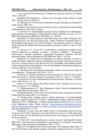 Moskalyuk T.A., Repin E.N. On Monitoring the Natural Dynamics of Forests in Southern Primorye Using Pine and Oak Communities as an Example. Monitoring the Vegetation Cover of Protected Areas of the Russian Far East: Proceedings of the Working Session. Vladivostok, Botanical Garden-Institute of the Far East Branch of the Russian Academy of Sciences, 2002, pp. 156-163. (In Russ.).