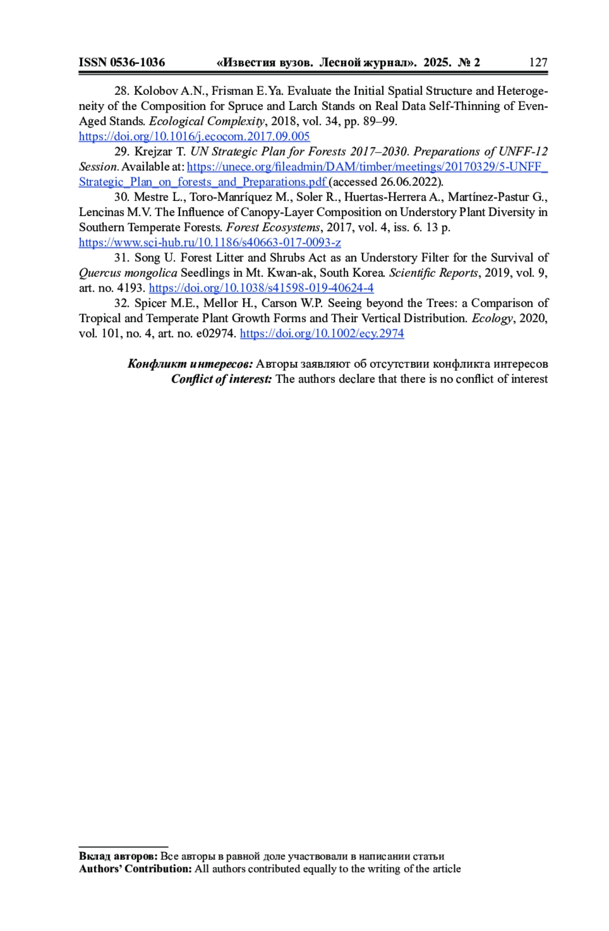 28. Kolobov A.N., Frisman E.Ya. Evaluate the Initial Spatial Structure and Heterogeneity of the Composition for Spruce and Larch Stands on Real Data Self-Thinning of Even-Aged Stands. Ecological Complexity, 2018, vol. 34, pp. 89-99. DOI: 10.1016/j.ecocom.2017.09.005 EDN: ONKONQ