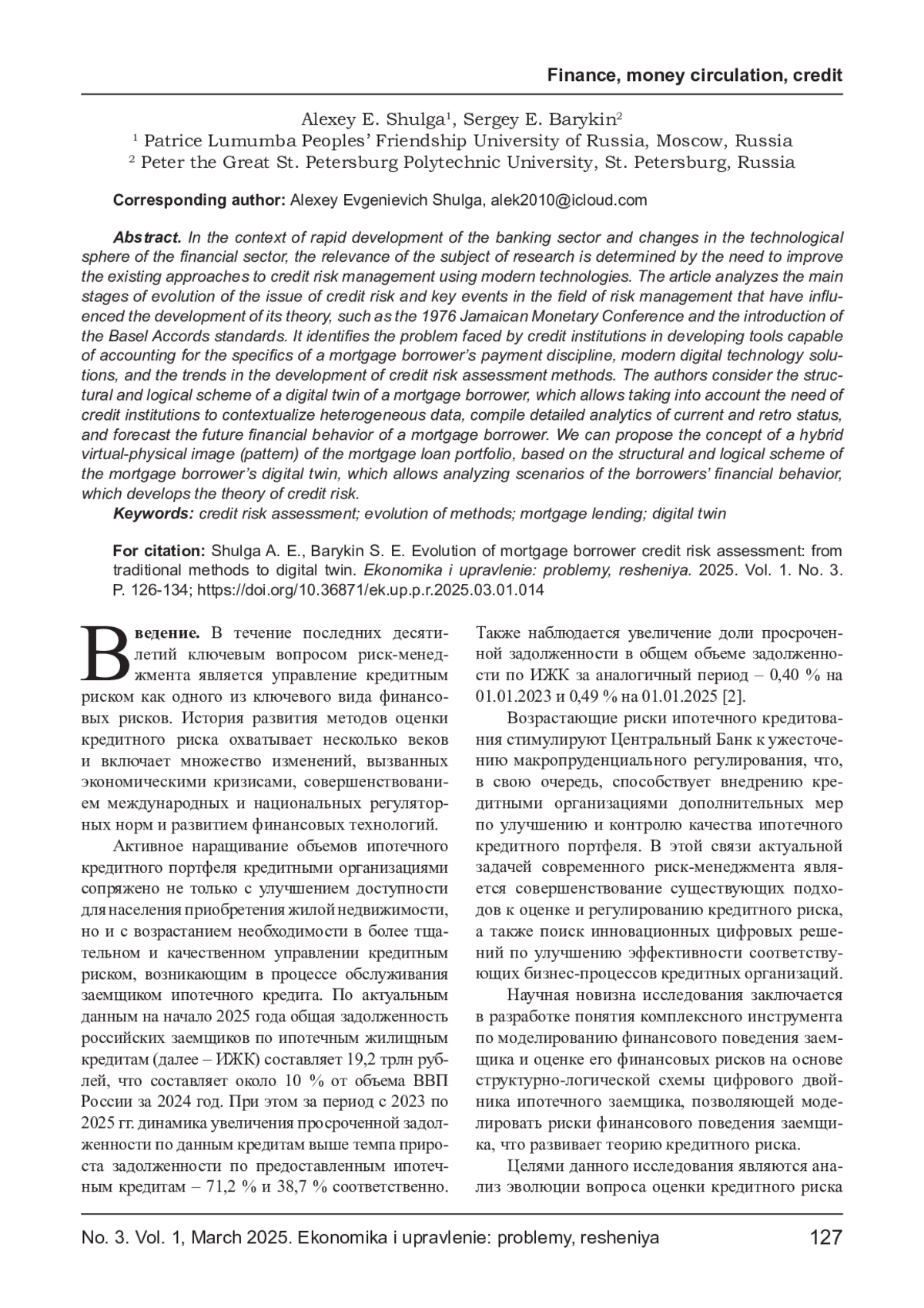 В условиях стремительного развития банковского сектора и изменений в технологической сфере финансового сектора, актуальность предмета исследования определяется необходимостью совершенствования существующих подходов к управлению кредитным риском с использованием современных технологий. В статье проанализированы основные этапы эволюции вопроса кредитного риска и ключевые события в сфере риск-менеджмента, оказавшие влияние на развитие теории вопроса, такие как: Ямайская валютная конференция 1976 года и введение стандартов «Базельские соглашения». Выявлена проблема потребности кредитных организаций в разработке инструментов, способных учесть особенности платежной дисциплины ипотечного заемщика, современные решения в области цифровых технологий и тренды развития методов оценки кредитного риска. Авторами рассмотрена структурно-логическая схема цифрового двойника ипотечного заемщика, позволяющая учесть потребность кредитных организаций в контекстуализации разнородных данных, составлении подробной аналитики текущего и ретро состояния, и прогнозировании будущего финансового поведения ипотечного заемщика. Можно предложить понятие гибридного виртуально-физического образа (паттерна) ипотечного кредитного портфеля, на основе структурно-логической схемы цифрового двойника ипотечного заемщика, позволяющего анализировать сценарии финансового поведения заемщиков, что развивает теорию кредитного риска.