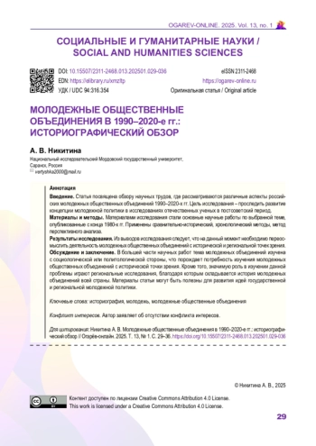 Введение. Статья посвящена обзору научных трудов, где рассматриваются различные аспекты российских молодежных общественных объединений 1990–2020-х гг. Цель исследования – проследить развитие концепции молодежной политики в исследованиях отечественных ученых в постсоветский период.